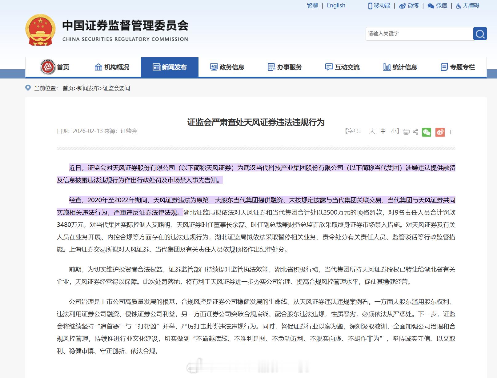 天风证券最近的处罚不断:2 月 10 日还在投资者平台说没有应披露而未披露的事宜。今天就表示近期收到中国证监会下发的《立案告知书》,因涉嫌福建省永安林业(集团)股份有限公司持股变动信息披露违法违规,根据相关法律法规,决定对公司立案。同一日证监会也公布天风证券武汉当代集团涉嫌违法提供融资及信息披露违法违规行为作出行政处罚及市场禁入事先告知。