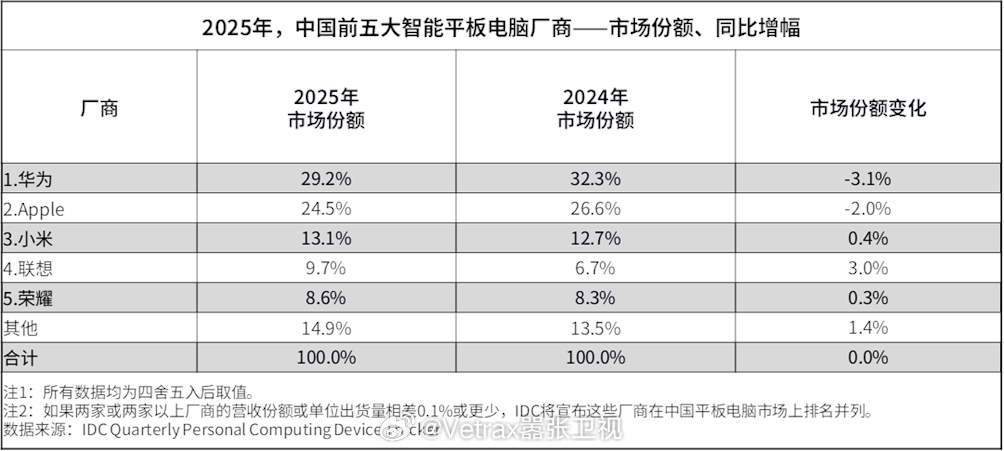 · 华为延续2025年度中国平板电脑市场出货量第一位。第四季度推出新品MatePad Edge,强化平板在办公及多场景使用中的定位,带动市场关注度维持高位。