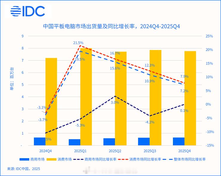从季度表现来看,2025 年第四季度中国平板电脑市场出货量同比增长7.2%。在换机周期延续及厂商持续推动产品功能升级的背景下,市场出货规模保持增长态势。
