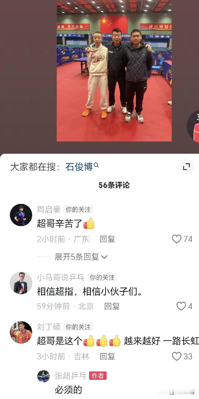 周启豪这是回广东了吧,看来是昨天跑完一万米,大家就放假了吧。 刚刚看到张超发抖音,广东队又有两位队员打进国家二队了,分别是U19的龙宇和U17的石俊博,看到张超还在河北带着队员比赛,估计比赛结束才能回广州。超哥每次发抖音,都会艾特很多人,这次看到周启豪、牛冠凯、小马哥、刘丁硕都来给超哥留言了。 看到周启豪这是回广东了,看来国乒是休假了,今天就看到有博主说他们放假,林诗栋还去玉桥餐厅吃饭了。看来大家是回去过年了,过了年再回北京,然后一起出发飞新加坡打比赛。运动员们也不容易啊,每年过年的时候都有比赛,在家待不了几天。 新加坡大满贯赛周启豪有单打的比赛,回去广州应该也会去省队训练吧。现在广东队又有新人打进国家队,周启豪就是大哥了,昨天看到周启豪发动态的时候,和黄旭男一起合影,新的一年继续加油吧!