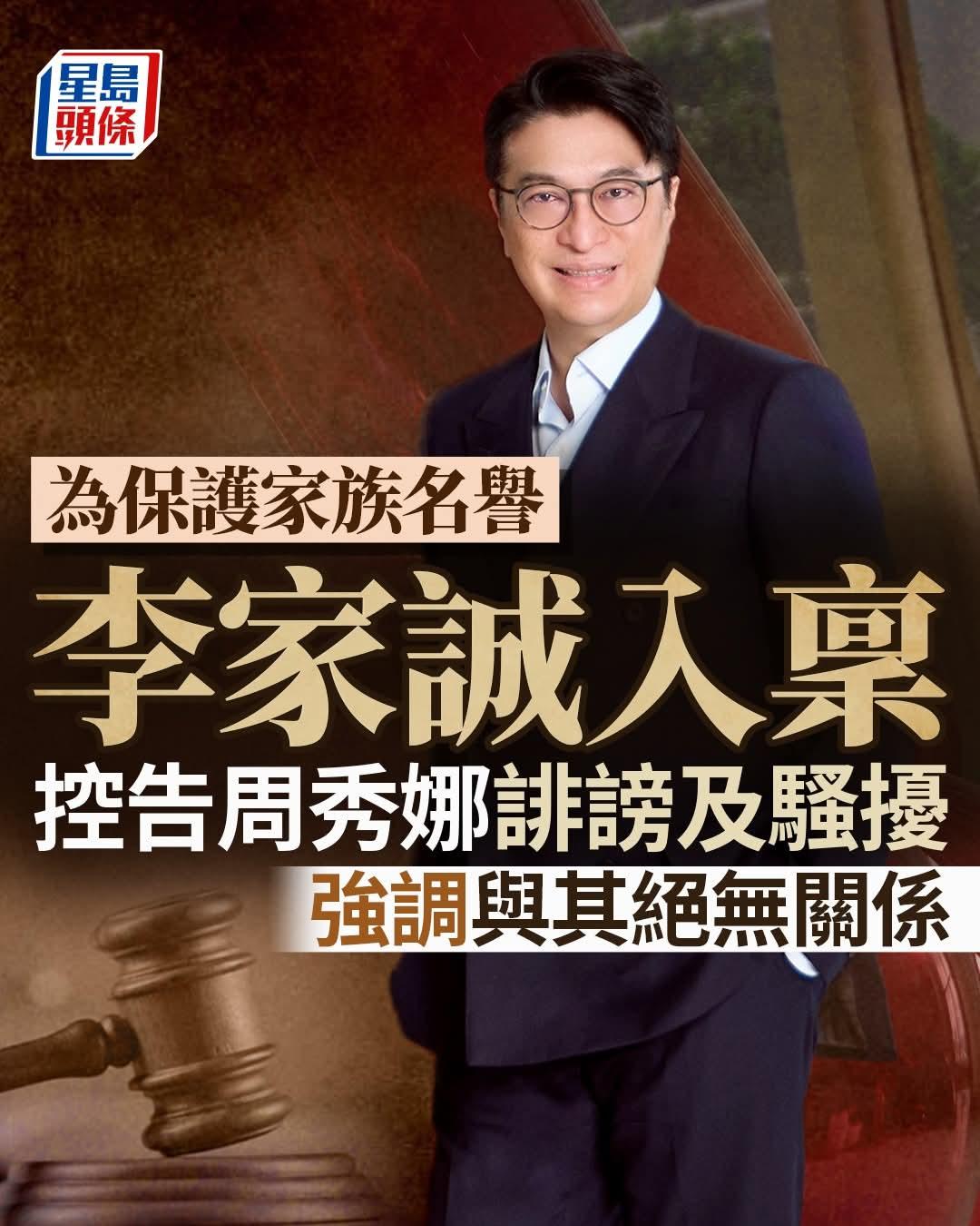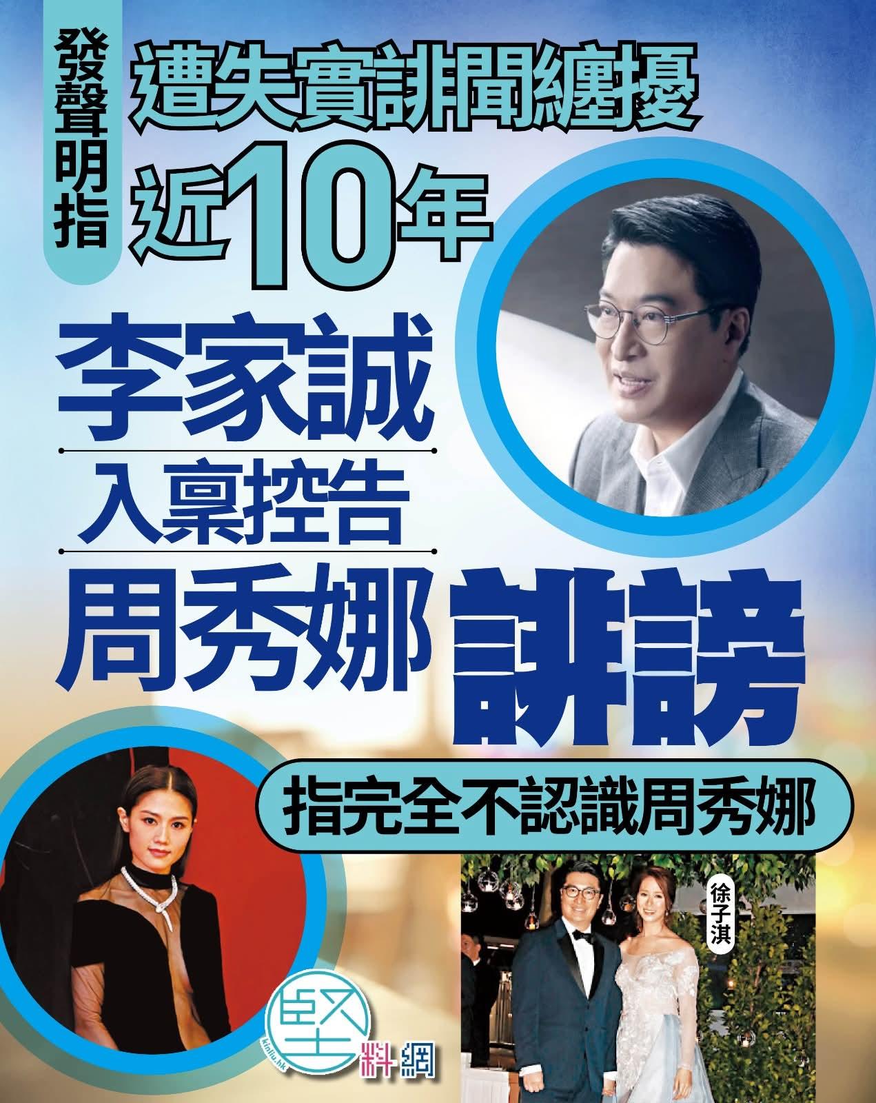 不是果位"李嘉诚",係另一位"李家诚"控告周秀娜、Google 及 5 个 YouTube 频道涉诽谤。 艺人周秀娜、五个YouTube频道及Google LLC遭恒基兆业创办人李兆基儿子李家诚今日入禀高等法院控告诽谤及骚扰。李家诚经法律代表发表声明,指周秀娜引发虚假传闻,强调绝不认识对方,亦与她绝无任何关係。涉事五个YouTube频道,包括Smart Travel、娱乐爆爆爆、Happy 娱乐、娱乐大嗨家, 娱乐加油站。 李家诚在申索陈述书指,事件源于2016年周秀娜宣传电影期间,引发媒体以「搭上已婚超级富二代」等标题炒作,令他及家人受困扰。他曾发律师信警告,对方未有收敛。去年6月,周秀娜再于访问重提被包养传闻,李家诚直斥对方为个人宣传,在他们父亲离世后于「伤口上洒盐」,令他和家人忍无可忍。 他又指过去近10年,相关失实内容在内地、香港及社交平台持续发酵,部分更牵涉太太及已故父亲李兆基。他曾多次要求Google移除诽谤影片,但对方未有行动。他强调一直以「清者自清」心态沉默,但反令别有用心者变本加厉,今次决定採取法律行动,讨回公道。 李家诚入稟控告周秀娜诽谤及骚扰李家诚控告周秀娜