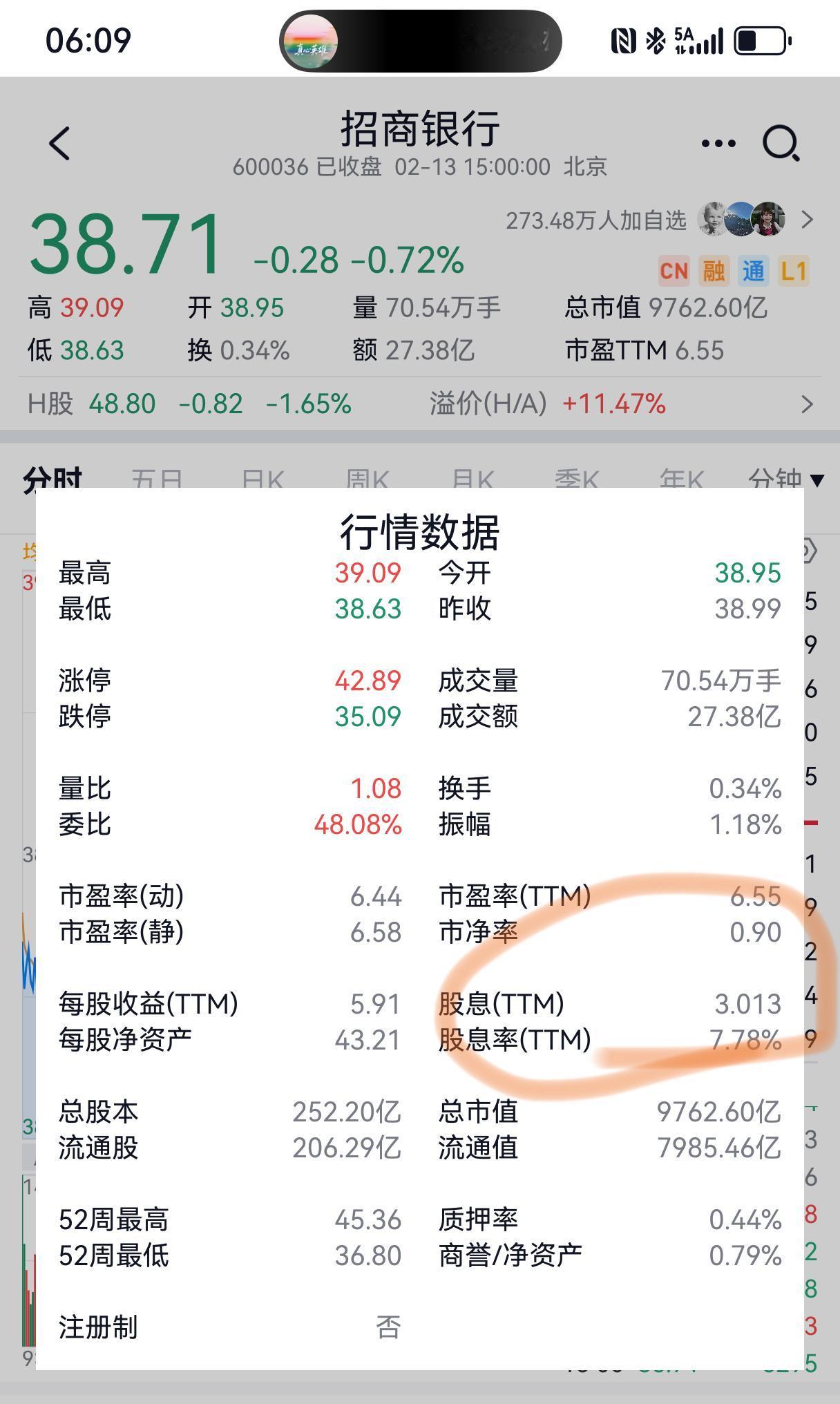 最近经常看到有人说招商银行的股息率将近8%,甚至认为真是招行不行的表现,让人非常无语,根本原因还是大多数散户缺乏基本的财务知识。这个8%是股息率(TTM)数据,而股息率(TTM)的计算是有个对应的统计区间,也就是TTM,指的是Trailing Twelve Months,也就是说股息率(TTM)的统计区间是过去12个月;但因为今年招商银行进行了中期分红,所以过去12个月的分红涵盖了针对2024年度经营业绩的分红和针对2025半年度经营业绩的分红。有了这个概念,就可以估算准确的股息率应该是5%多一点,具体计算公式为:针对2025年度业绩的分红/股价。