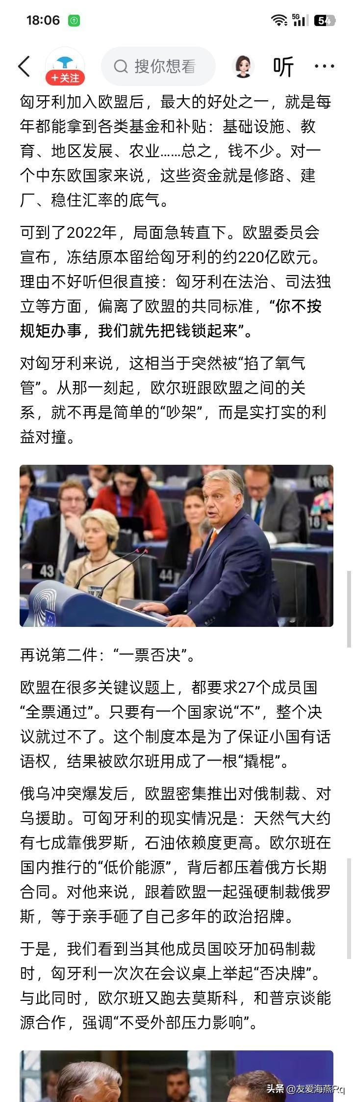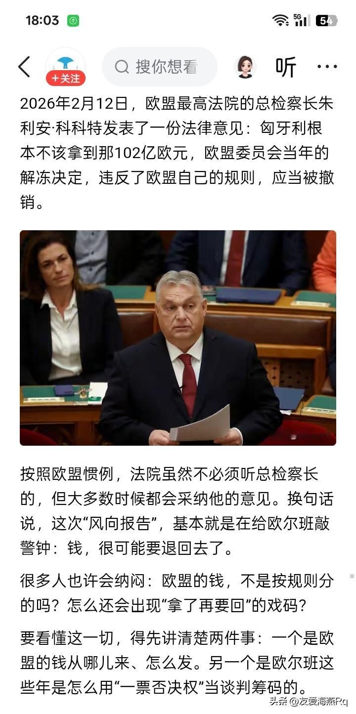 这是敲响终结的钟声吗? 匈牙利再有不久的时间之后就要进行大选,现在欧尔班领导的执政党青民盟的支持率,本来就在民调中,已经严重落后于反对党“蒂萨党”好几个百分点。 然而,这还不算什么,更要命的事情又突然出现,欧盟最高法院的总检察长又抛出来了一个新问题:欧盟委员会以前作出对匈牙利解冻的102亿欧元资金的决定,违反了欧盟自己制定的规则,应该撤销该决定。并且102亿欧元资金如果已经发放给匈牙利,还很可能被追回的情况发生。 102亿欧元,对于匈牙利这个仅仅大约不过950万左右人口的国家来说,无疑是一笔相当巨大的财富。但假如因为欧尔班领导的现政府的原因,从而化为子虚乌有,灰飞烟灭,估计对欧尔班领导的青民盟在很快就要到的大选的支持率不是个好消息。甚至有可能,发生的这件事情,就是专门为欧尔班下台进行助力。
