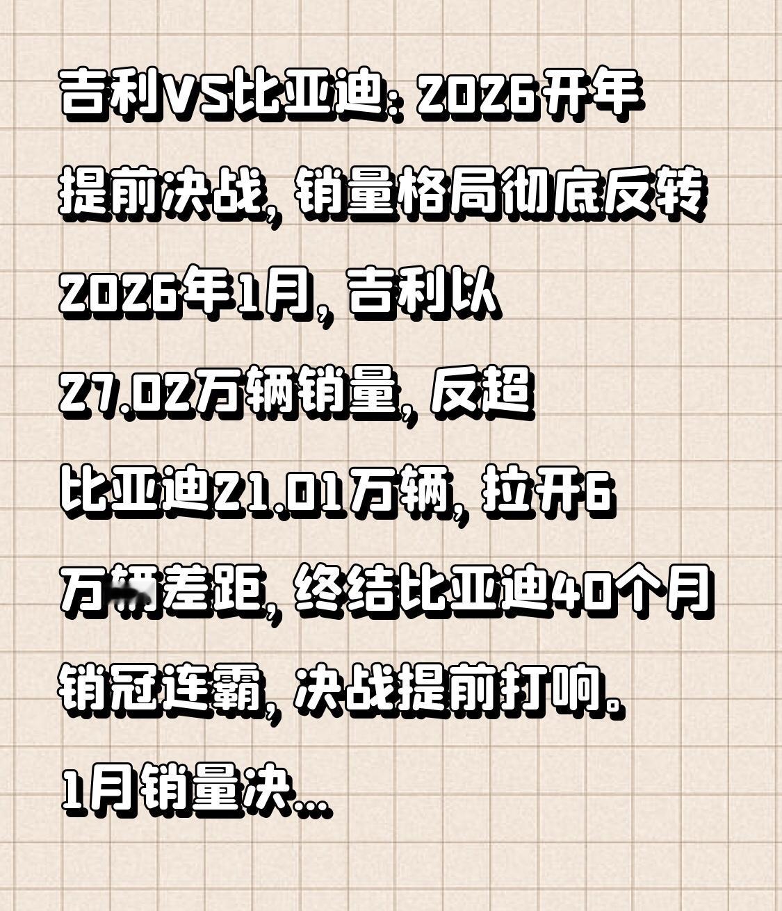 2026年1月,吉利以27.02万辆销量,反超比亚迪21.01万辆,拉开6万辆差距,终结比亚迪40个月销冠连霸,决战提前打响。