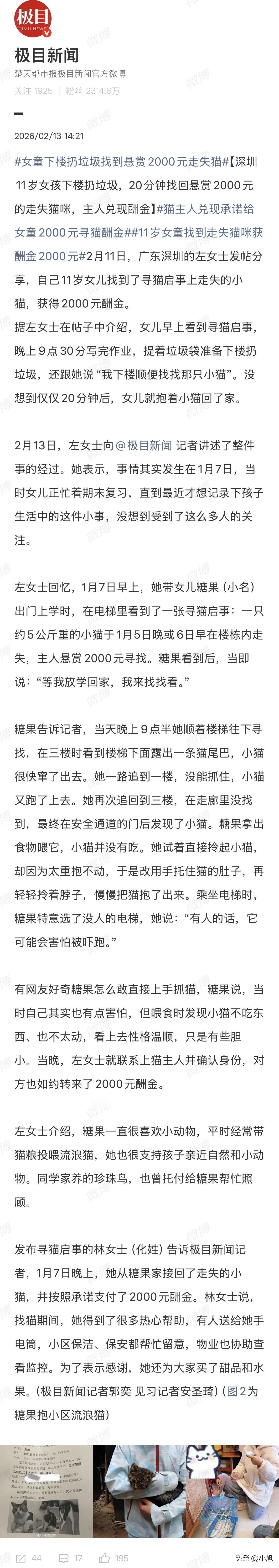为小姑娘点赞!深圳一个11岁的小姑娘,晚上9点半写完作业,提着垃圾袋下楼扔垃圾。就这么一个再普通不过的日常家务,20分钟后,她怀里抱着一只大胖猫回来了,手里还多了2000块钱。 小姑娘叫糖果,1月7号早上跟妈妈出门上学,在电梯里看到一张寻猫启事。一只5公斤重的小猫在楼里走丢了,主人悬赏2000块找猫。糖果当时就跟妈妈说,等我放学回来找找看。 说实话,这种话大人通常听听就过去了。孩子随口一说,谁当真? 但糖果当真了。 晚上9点半,她写完作业下楼扔垃圾,真就顺带着找猫。走楼梯下去的,走到三楼的时候,瞅见楼梯底下露出条猫尾巴。 猫跑了。她追到一楼,没抓住。猫又窜回三楼。她又追回去,在三楼走廊找了一圈没有,最后在安全通道的门后头发现了那只猫。 整个过程就跟电影追车戏似的,只不过主角换成了一个小学生和一只受惊的猫。 糖果带了食物喂猫,猫不吃。她试着直接拎起来,结果5公斤的猫太重了,抱不动。小姑娘就换了个姿势,一只手托着猫肚子,一只手轻轻拎着脖子,慢慢抱了出来。 坐电梯的时候,她还特意选了没人的电梯。她说,有人的话猫可能会害怕吓跑。 这话说得,多少大人办事都没这么细致。 回到家,妈妈联系了猫主人。对方连夜过来接猫,当场转过来2000块钱。 有网友问糖果,你不怕猫挠你吗?糖果说有点害怕,但喂食的时候发现猫不吃东西也不怎么动,看着性格温顺,就是有点胆小。 这话听着简单,但这里面有个细节很多人没注意到——这个小姑娘懂得观察和判断。她不是愣头青直接上手,而是先喂食,观察猫的反应,确认安全才动手。这种沉稳,很多大人都没有。 猫主人林女士说,找猫那几天,小区保洁、保安都帮忙留意,物业也帮着看监控,有人还送她手电筒。猫找回来之后,她给大家买了甜品和水果表示感谢。 糖果妈妈发帖说,女儿一直喜欢小动物,平时经常带猫粮喂流浪猫,同学家的珍珠鸟也托付给她照顾过。 这事被发到网上之后,评论区炸了。 有人说,这孩子有福气,扔个垃圾都能捡2000块。 有人说,这是平时积德,经常喂流浪猫,猫都认识她了。 也有人说,换个孩子下去找,真不一定能找到。这不是运气,是这孩子有脑子。 确实,同样是找猫,有人满世界贴启事,有人花钱请专业团队,最后都不如一个写完作业下楼扔垃圾的小学生。 2000块钱对11岁的小姑娘来说不是小数目。但比钱更值钱的,是她在整个过程中展现出来的东西:看到启事就记在心里、写完作业立刻行动、追猫的时候不放弃、抱猫的时候知道躲着人坐电梯。 这些细节,比2000块钱值钱多了。 话说回来,猫主人也是个爽快人。启事上写2000,见面就转2000,没含糊。这种说话算话的主,难怪小区里那么多人愿意帮忙。 一只走丢的猫,一张2000块的启事,一个下楼扔垃圾的小女孩,一场20分钟的追逐。这个故事里没有坏人,只有说话算话的大人和说话算话的孩子。 你觉得,这孩子能顺利拿到这2000块,靠的是运气,还是别的什么?