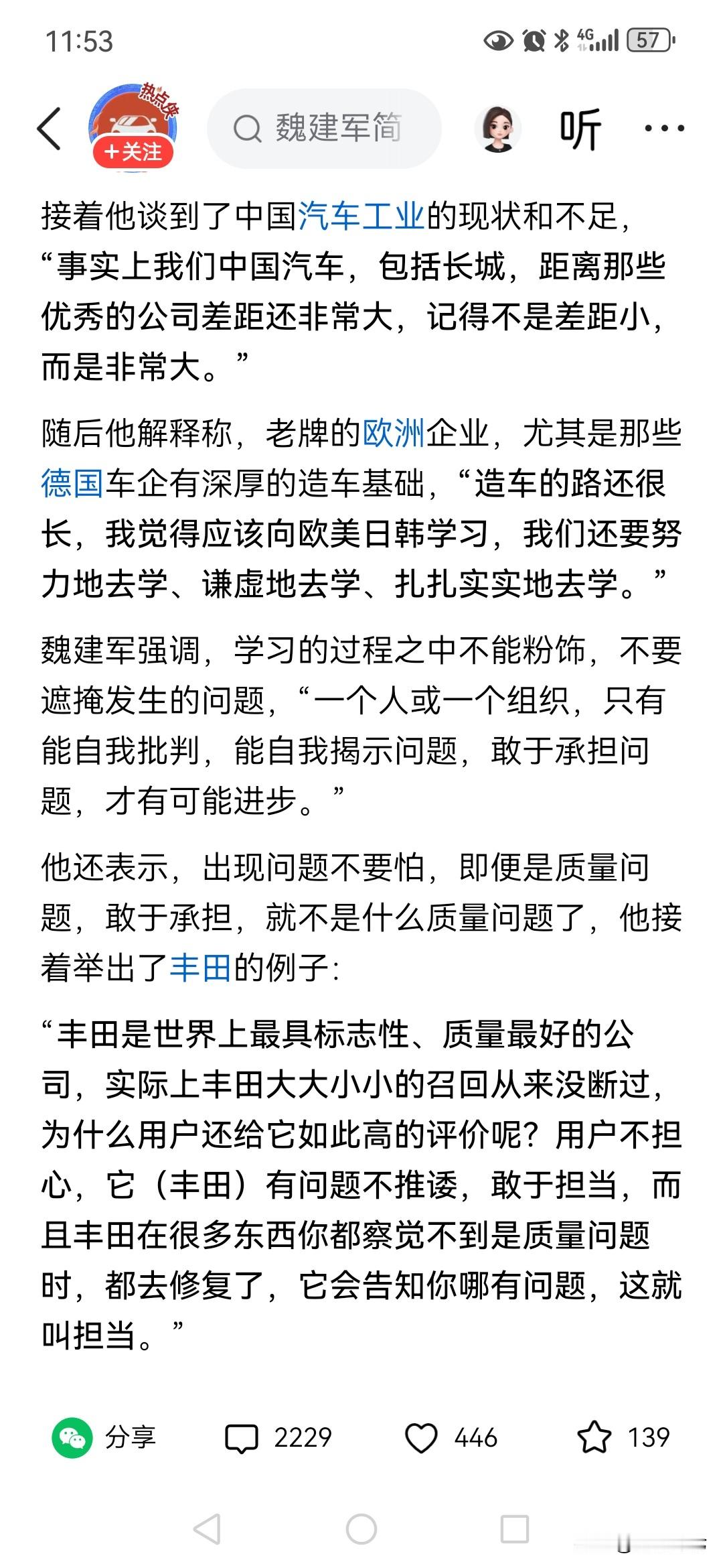 魏建军说,中国汽车和欧美日韩优秀车企差距还非常大,不是差距小,是非常大,应该向欧美日韩学习,要努力地去学、谦虚地去学、扎扎实实地去学。