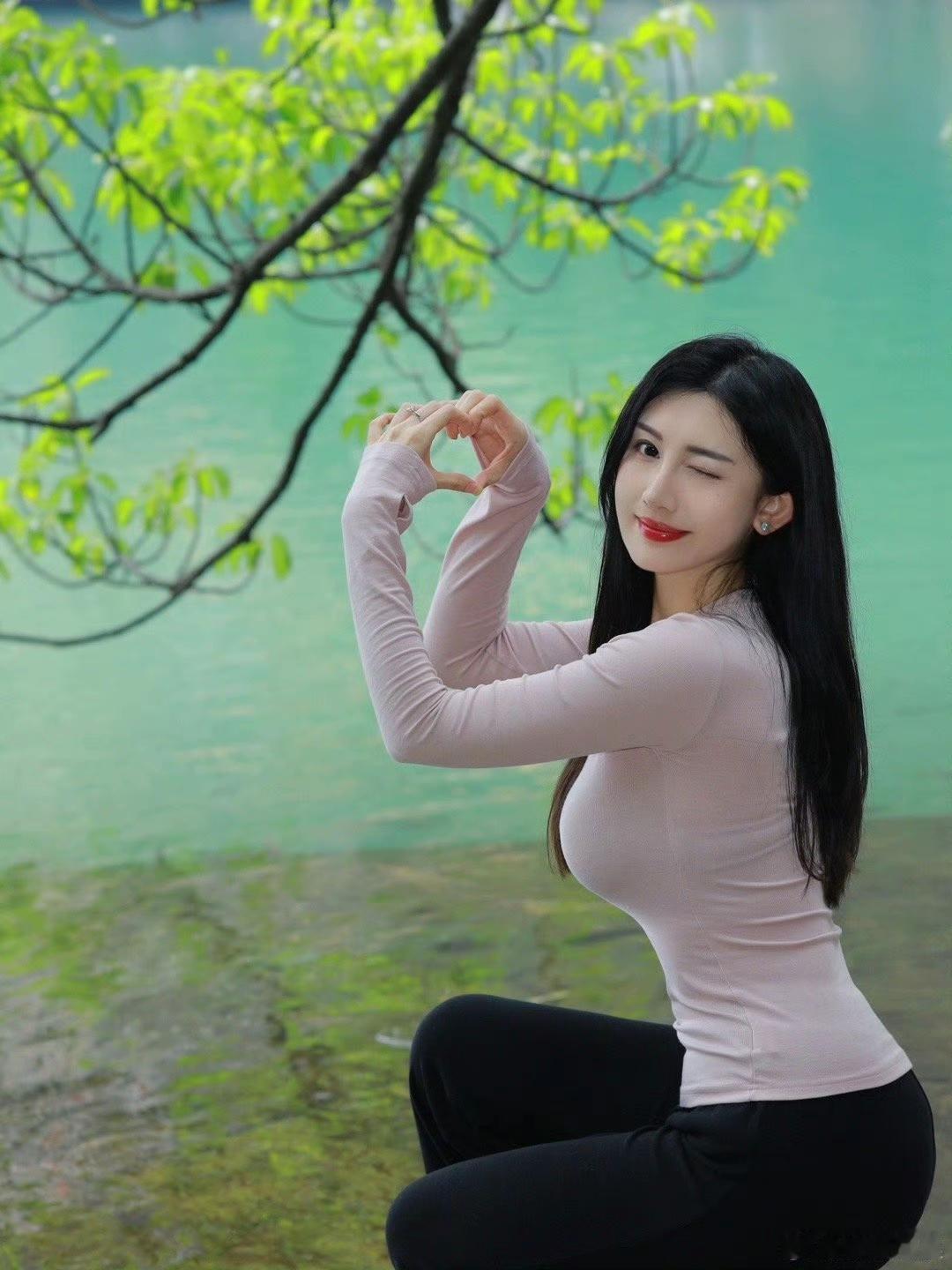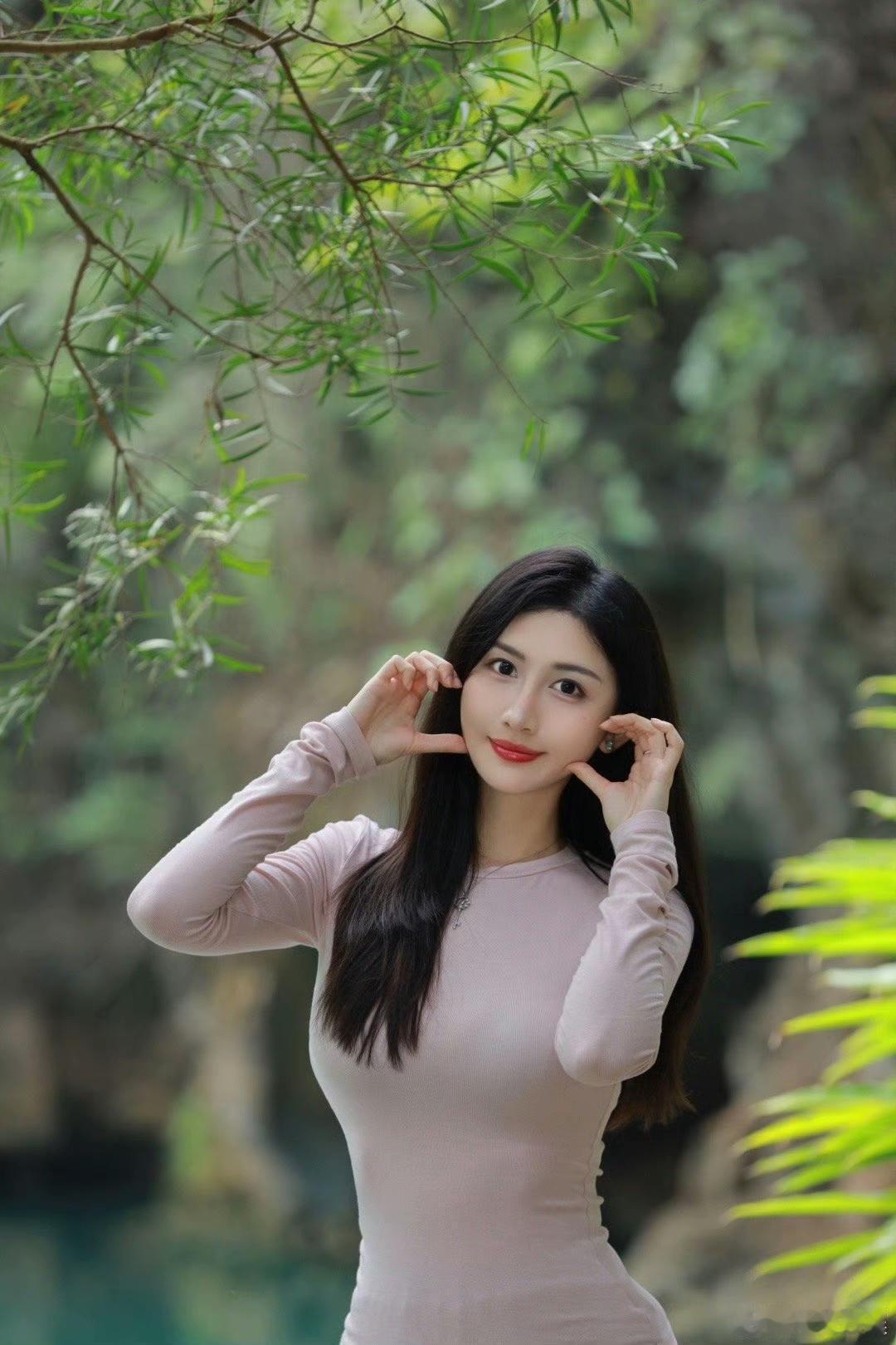 在绿意盎然的背景下,优雅地伸展双臂,享受自然的美好。