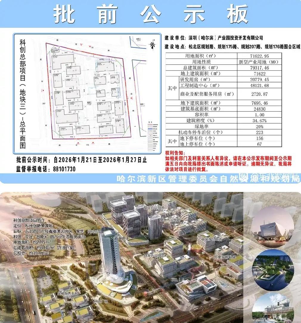 恭喜哈尔滨、恭喜哈尔滨。最近有热心市民发现哈尔滨深圳产业园科创总部项目终于有了最新进展,如果顺利的话估计4月份这个项目就能动工。 从效果图上看这里将会建设科创总部大厦、研发办公组团、复合办公组团、国家孵化器、展览中心、金融服务中心等。 可以说这个项目的落地意味着哈深产业园发展达到了全新的高度,借此契机可以带动松北区的繁华。相信若干年后哈尔滨江北新区的外来人口会越来越多,最终哈尔滨会像武汉那样真正实现一江两岸共繁荣。