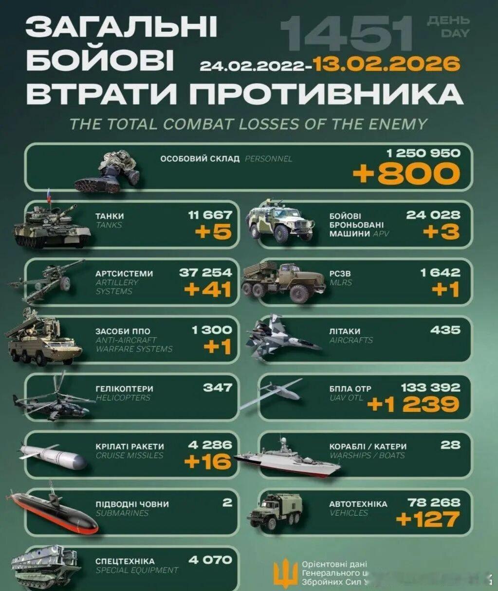 乌俄战争进入第1451天,乌克兰总参谋部发布战报:过去24小时乌俄双方交战72次,其中15次在胡利亚伊波列(11次在苏梅)、9次在托列茨克、10次在莱曼、22次在波克罗夫斯克、5次在南顿涅茨克区域。毙伤俄800名。俄军累计损失1250950人。摧毁俄5辆坦克、3辆装甲车、41门火炮、1个火箭发射装置、1套防空系统、1239架大型无人机、127辆军车、16枚导弹。
