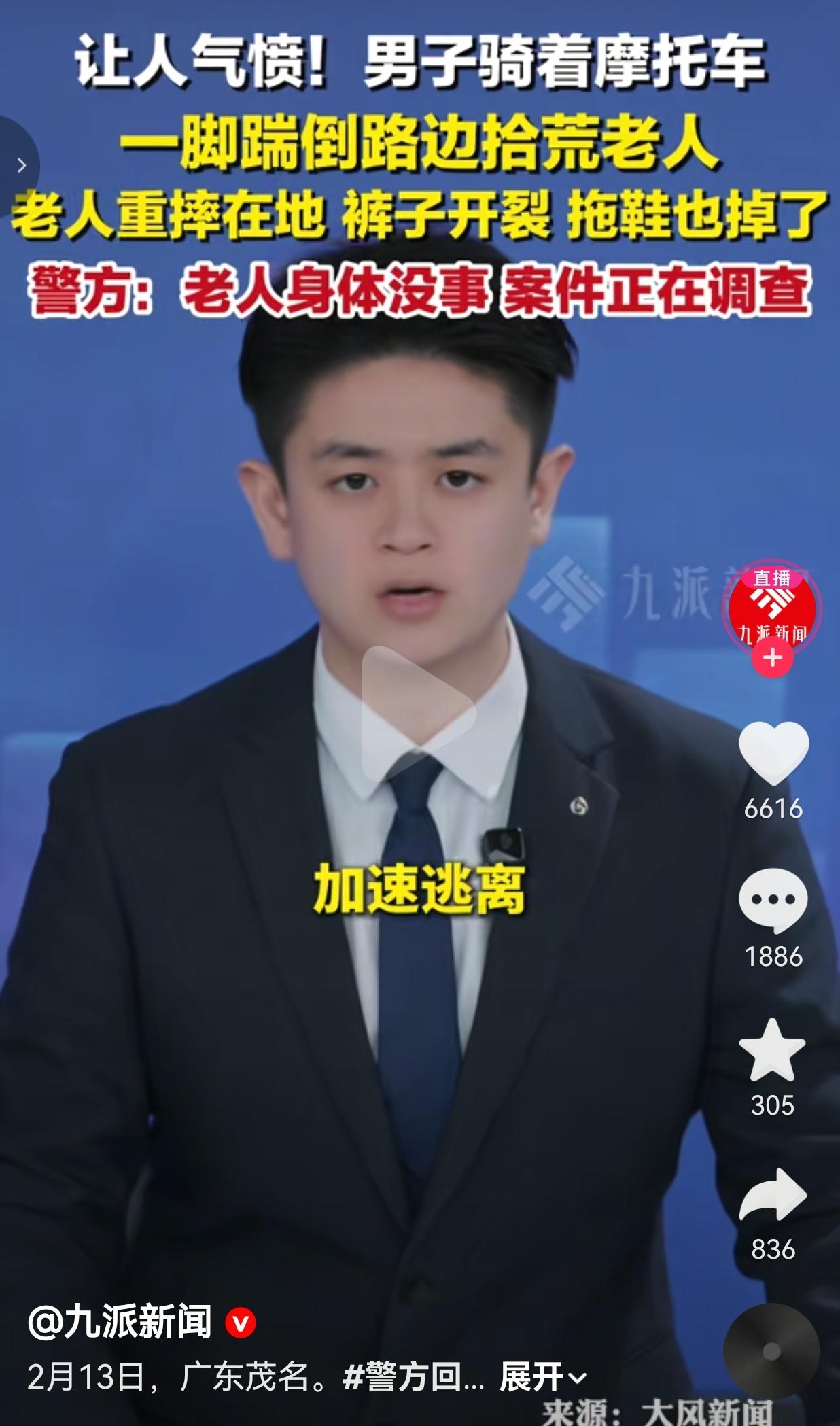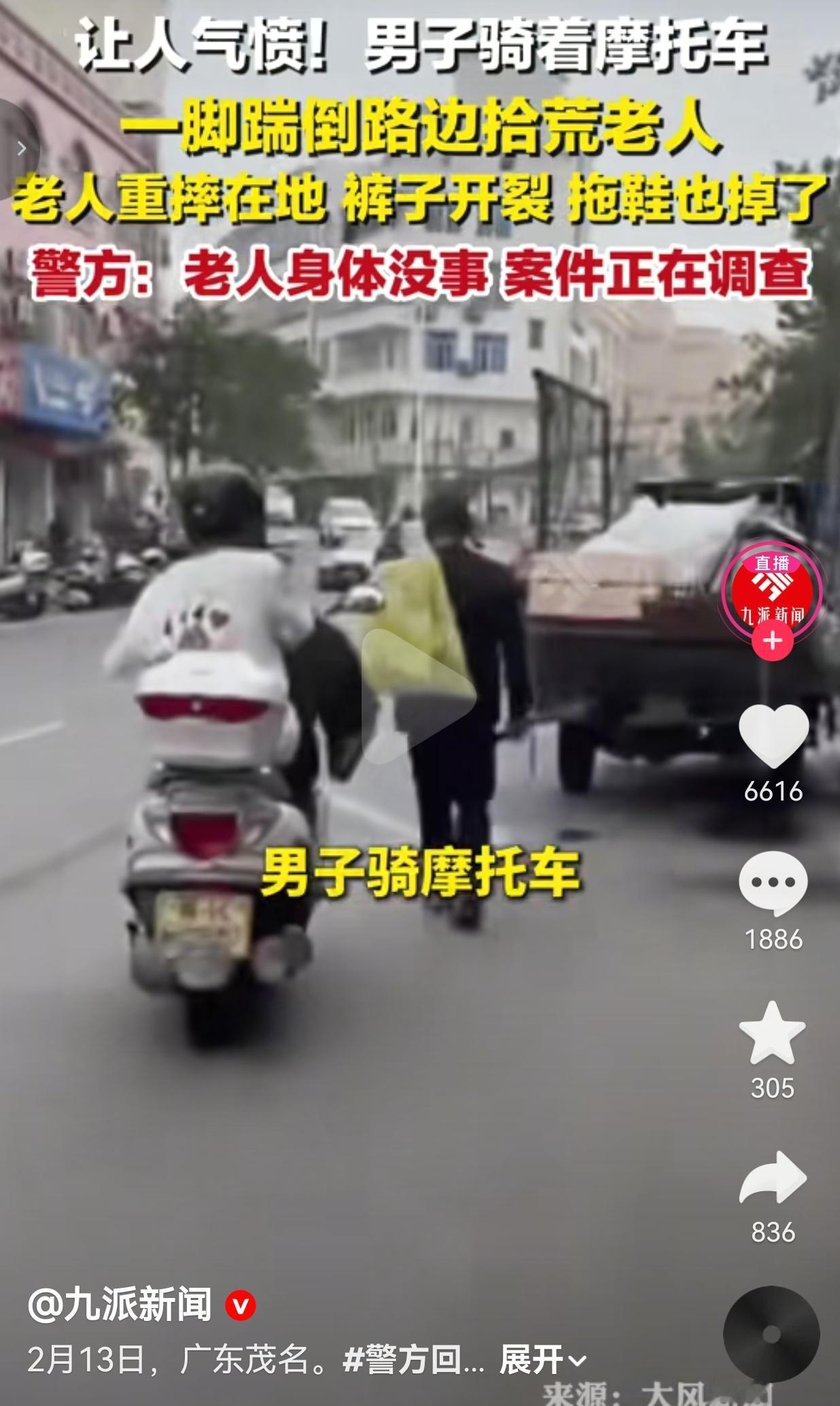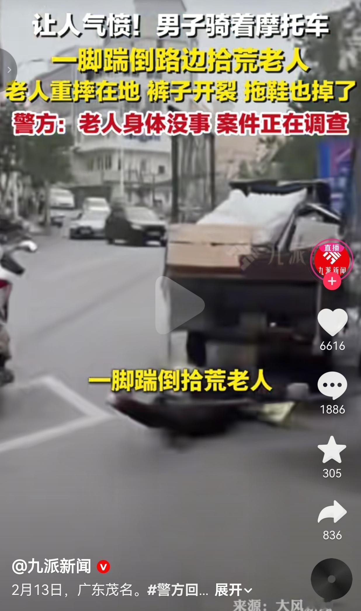 太恶劣了!必须严惩!茂名街头这一脚,看得人血压飙升! 2月13日,广东茂名发生的这件事,真的越想越气,简直刷新大家的底线! 一个拾荒老人,背着袋子,安安静静走在路边,没挡路、没骂人、没招惹任何人,就想安安稳稳捡点废品换口饭吃,日子已经够难了。 结果呢?祸从天降。 一辆摩托车悄悄从后面靠过来,骑车的人戴着头盔遮着脸,不减速、不按喇叭,走到老人身边,突然狠狠一脚踹在老人后腰上! 老人当场就像个没力气的布娃娃,“扑通”一声重重摔在地上,裤子破了,拖鞋飞了,趴在地上半天爬不起来,看着都疼。 更让人寒心的是,车后面还跟着一个人,全程举着手机拍,视频里那阵幸灾乐祸的笑声,清清楚楚、刺耳难听,像针一样扎进人心里。 要我说,这哪是开玩笑?这就是故意伤人、是欺负弱者、是拿别人的痛苦当乐子! 很快,石鼓派出所接到报警,立刻介入调查,情况已经掌握,正在处理。万幸的是,老人身体没大事,可人没事,不代表这事就能算了。 一句“闹着玩”,掩盖不了恶意;一句“没受伤”,也抹不掉对老人的惊吓和尊严的践踏。 老人本本分分活着,不偷不抢,凭力气讨生活,凭什么要受这种罪? 今天敢无缘无故踹老人,明天就敢对别的弱者下手。人心一旦坏了,比什么都可怕。 这种冷漠、这种霸凌、这种毫无底线的恶,真的不能惯着,必须严肃处理、严惩不贷! 人间烟火气,最抚凡人心,可也最容不得这种欺软怕硬、冷血无情的恶。 你觉得,对这种人,该不该从重处理?