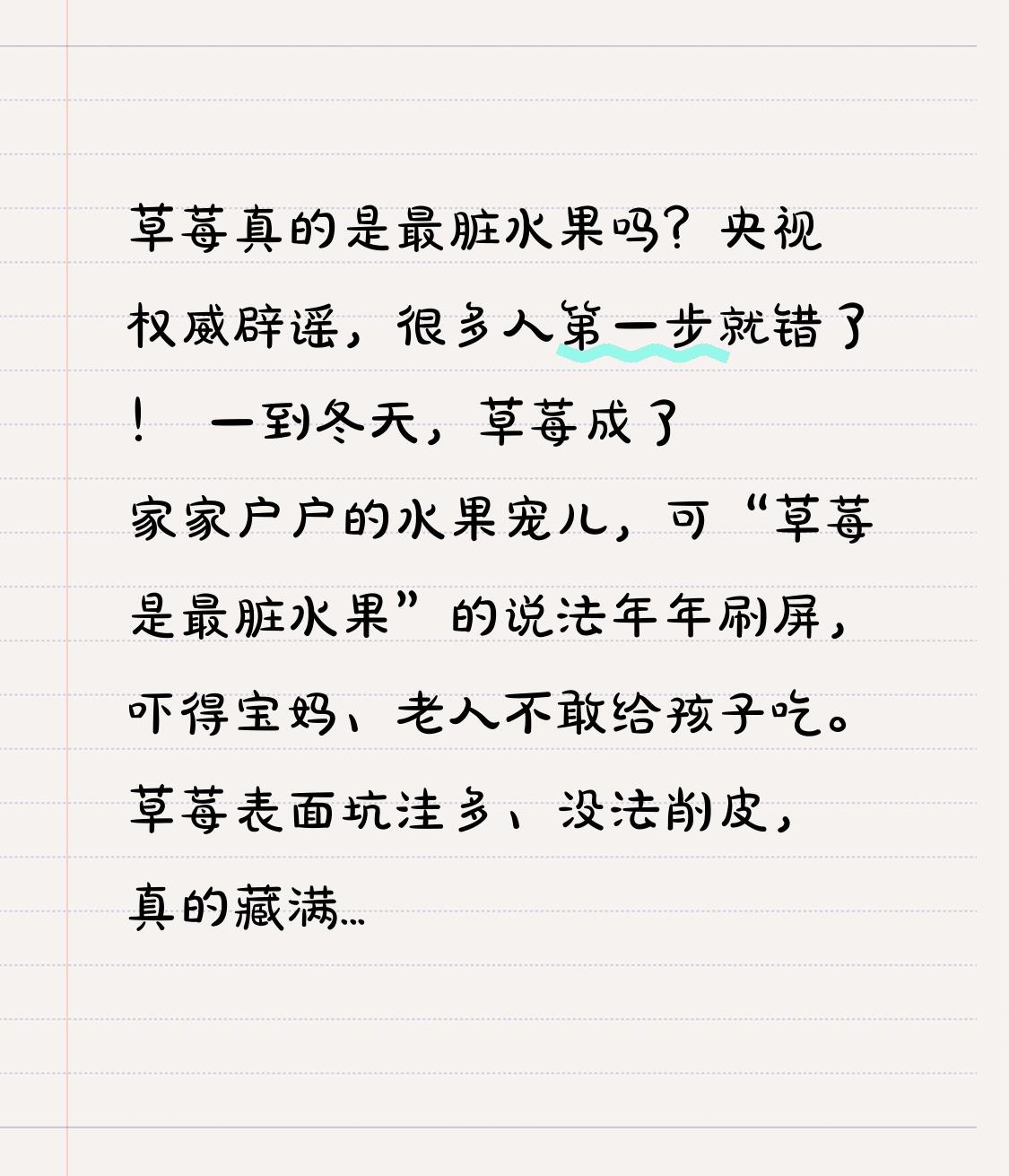 草莓真的是最脏水果吗?央视权威辟谣,很多人第一步就错了! 一到冬天,草莓成了家家户户的水果宠儿,可“草莓是最脏水果”的说法年年刷屏,吓得宝妈、老人不敢给孩子吃。草莓表面坑洼多、没法削皮,真的藏满农药和脏东西吗?今天一次说透真相,别再让草莓背黑锅! 很多人被美国民间机构EWG的“最脏果蔬榜单”吓到,说草莓连续多年排第一,农残检出率近99%,单颗能查出十几种农药。加上草莓贴地生长、表皮娇嫩无保护,大家越想越怕,觉得吃草莓等于吃农药,这也让“最脏水果”的谣言越传越广。 但转折点来了!央视、新华网、农业农村部接连辟谣,直接戳破谎言:检出农残≠农残超标,更不等于有毒。EWG只是民间环保组织,并非官方监管机构,只算农药种类、不看剂量,完全不科学。国内多地抽检显示,草莓合格率常年超98%,江苏、上海等地批次合格率甚至100%。 更关键的是,草莓靠蜜蜂授粉,花期严禁用药,农药只在育苗期少量使用,成熟时早已降解达标。我们担心的农残、虫卵、灰尘,只要清洗得当,完全能放心吃。很多人洗草莓先摘蒂、久浸泡、用洗洁精,反而让脏东西渗进果肉,越洗越不安全。 正确做法超简单:不摘蒂,用流动清水冲1分钟,或淡盐水/面粉水轻泡3分钟再冲净,农残去除率超90%,酸甜口感也不破坏。 别再被伪科学忽悠,也别忽视正确清洗。草莓营养高、口感好,正规渠道购买、科学清洗,大人孩子都能安心吃。别让谣言毁掉冬日的甜蜜,吃得明白、吃得放心,才是对家人最好的守护!