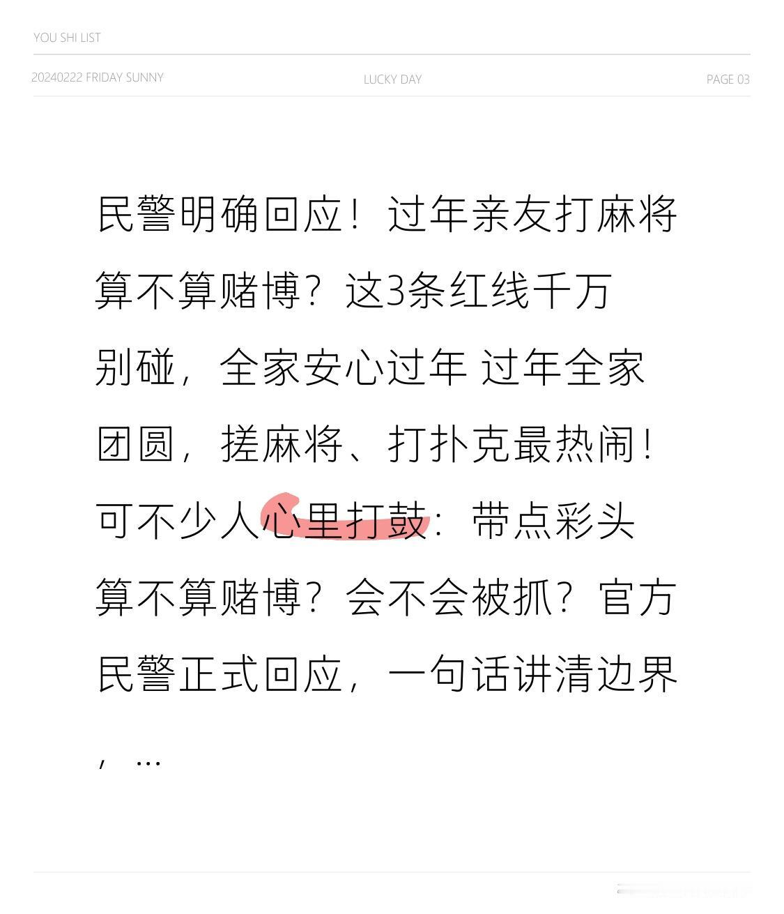 民警明确回应!过年亲友打麻将算不算赌博?这3条红线千万别碰,全家安心过年 过年全家团圆,搓麻将、打扑克最热闹!可不少人心里打鼓:带点彩头算不算赌博?会不会被抓?官方民警正式回应,一句话讲清边界,看完再也不慌! 很多人以为,只要是家人朋友一起玩,怎么赌都没事。大错特错!每年春节,都有人因为打牌赌钱被处罚,罚款、拘留,好好的年过得闹心,亲戚面前抬不起头。本来是图开心,别一不小心踩了法律红线! 关键转折点来了!民警直接划清安全线:不以营利为目的,亲属之间玩麻将、扑克,带少量财物输赢,纯属娱乐,不算赌博,不处罚;亲属之外的朋友、邻居,少量彩头、不牟利,也不算赌博。这是公安部明确规定,给大家吃下定心丸! 但这3种情况,一律按赌博处理,千万别碰!第一,以营利为目的,专门组局、抽台费、抽头渔利,不管输赢多少,直接违法;第二,赌资过大,超出“娱乐彩头”范围,各地标准不同,300元是通用警戒线,非亲友局超线就可能被罚;第三,聚众赌博、以赌为业,或玩炸金花、推牌九等纯押注玩法,一律严查! 简单说:家里自嗨、小彩头,放心玩;外面组局、赚抽成、赌大的,必严查!不少人踩坑,就是把娱乐变成赌钱,赢了得意,输了翻脸,既伤感情又违法。 过年的意义,是家人团聚、说说笑笑,不是比谁赢钱多。麻将是消遣,不是敛财工具;彩头是吉利,不是赌博筹码。别让一时贪念,毁了一年好心情,更别让团圆饭变成“后悔饭”。 记住民警的提醒:小赌怡情大赌违法,守住底线安心过年!快乐团圆比什么都重要,祝大家马年春节,平安喜乐、阖家幸福,玩得开心更玩得放心!