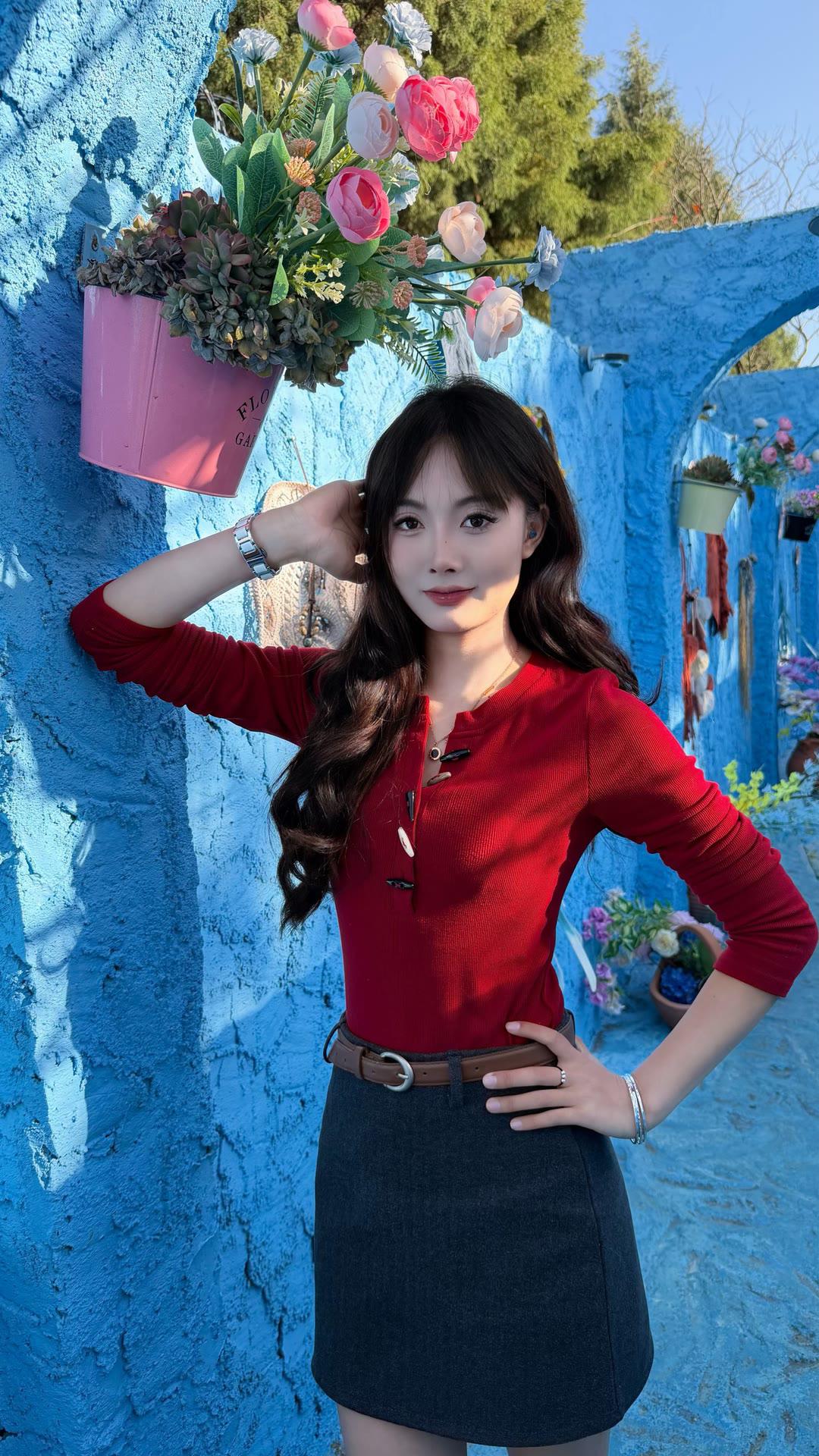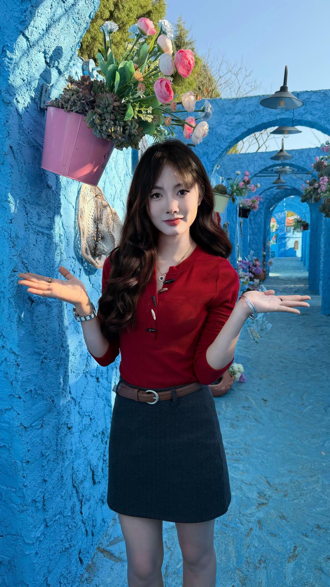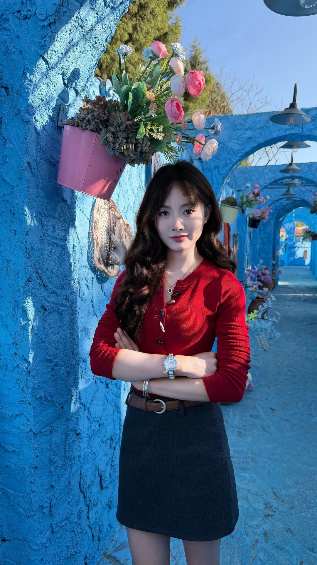 元气少女在古街市集,手捧花束,笑靥如花。分享街拍风采街拍美少女穿搭