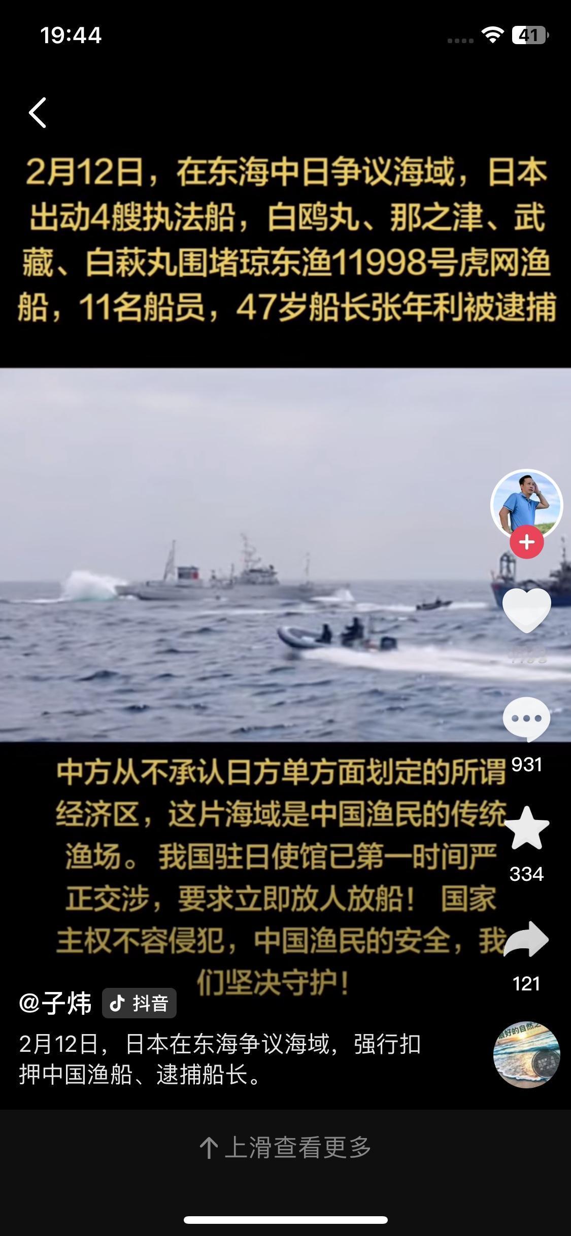 扣押我们的渔船,也太嚣张了吧! 为了抓咱们一艘普普通通的渔船,日本这次可是下了“血本”。 2026年2月12号,在日本长崎县五岛市女岛西南大概170公里的海面上,咱们一艘渔船被日方扣了。这片海域本来就是中日还没划清界限的区域,日方单方面说这里是他们的专属经济区,我们从来都不认可。 被扣的就是渔民日常出海捕鱼的普通虎网渔船,没有任何特殊用途,船上的人就是靠捕捞鲐鱼、竹䇲鱼维持生活的普通渔民,当天只是正常出海作业。 船上一共11名中国船员,日方为了扣押这样一艘民用小渔船,直接出动了白鸥丸、那之津、武藏、白萩丸四艘执法船围追堵截,强行把船扣了下来。 日方给出的理由,是怀疑渔船无视停船命令,违反了他们所谓的渔业主权法,当场就把船上47岁的船长带走,称要走刑事调查程序。 剩下的10名船员也被日方控制并接受调查,从目前公开的信息来看,船员人身安全暂时没有问题,但人和船都被扣留,无法正常返航。 之前就有渔民遭遇过类似的情况,船只被多扣几天,船上的渔获就会全部变质坏掉,渔网等渔具也会受损,再加上耽误出海作业,一趟下来直接损失好几万,这都是普通渔民养家糊口的钱。 我们已经明确表态,要求日方立刻放人放船,坚决维护我国渔民的合法权益。渔船 中国渔船 保卫渔船行动 渔船安全