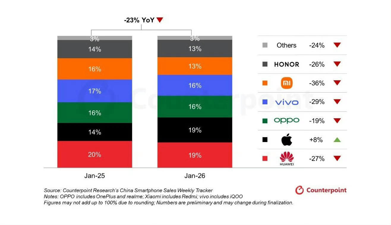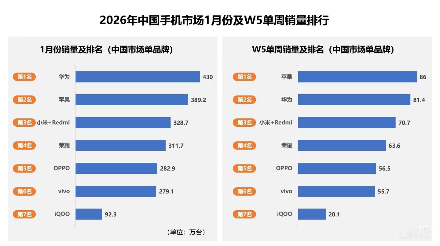 华为获1月中国手机销量第一把遥遥领先打在公屏上!华为即使下滑27%还是第一,苹果唯一逆势增长!