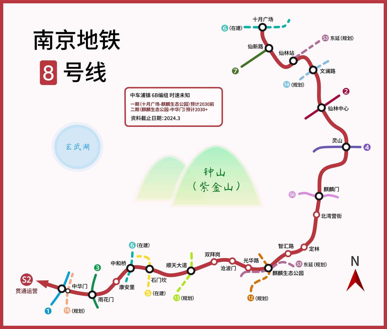 南京地铁8号线 规划中的南京地铁8号线全长47.5公里,全部为地下线路,共设置20座车站,妥妥的出行利器。它北起十月广场站,一路经过栖霞区、秦淮区等多个区,像十月广场站、仙林站等站点,把南京不少重要区域都串联起来了。 车辆采用6节编组B型列车,最高运营速度可达120km/h。线路规划与南京地铁S2号线(宁马线)贯通运营。这意味着出行的选择更多,范围也更广了。有了地铁8号线,南京的交通网络会更加四通八达! 南京地铁 地铁8号9号 8号线路线 南京交通地铁站 南京地铁进站