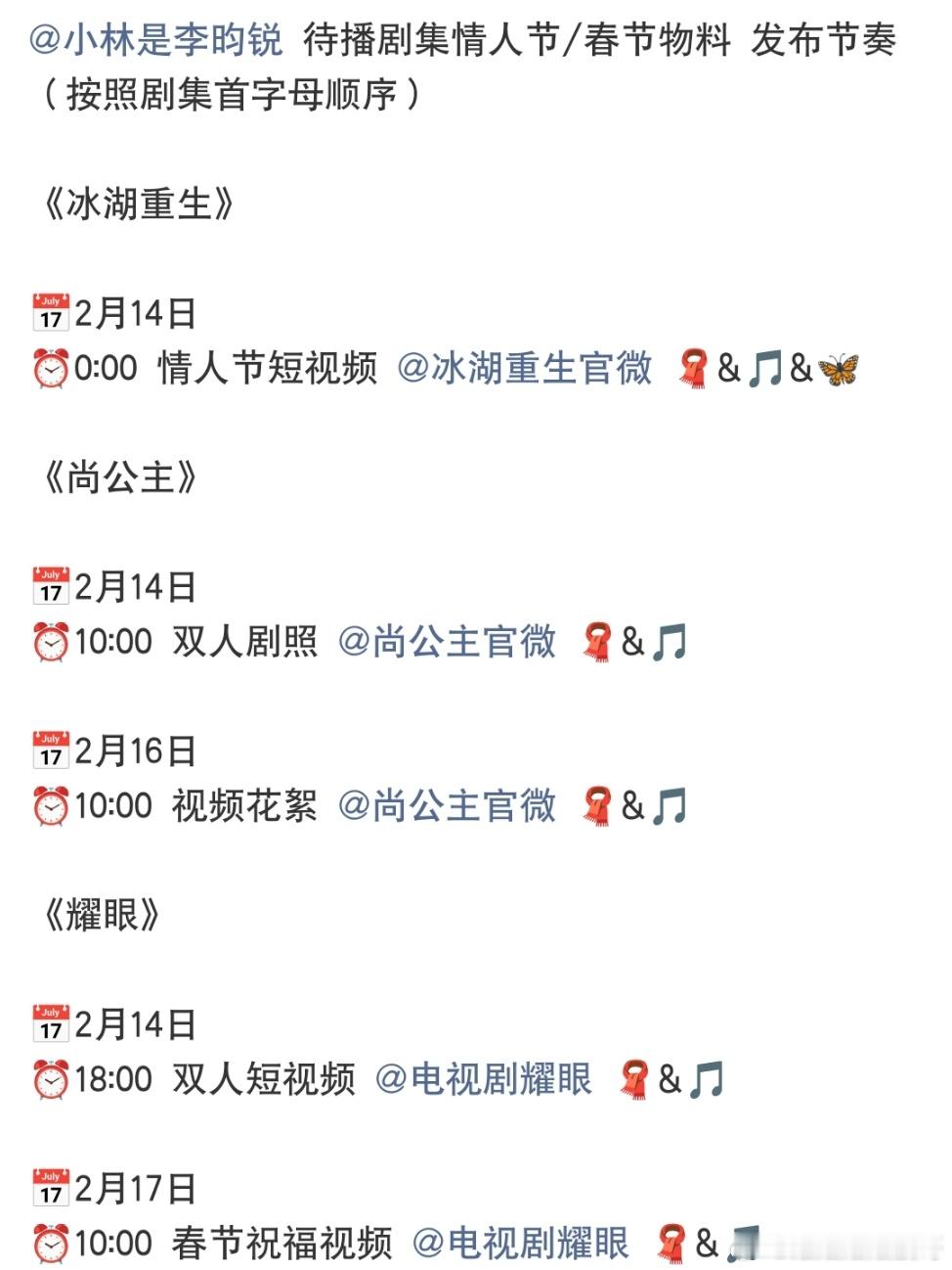 明天情人节各大待播剧官宣双人视频真是太期待了 《明月录》王楚然 辛云来《这一秒过火》王楚然 张凌赫《窈窈有期》何与 包上恩《江湖夜雨十年灯》周翎然 包上恩《炽夏》包上恩 周柯宇《三线谜回》孟子义 王弘毅《冰湖重生》李昀锐 黄杨钿甜 张康乐 李孝谦《耀眼》关晓彤 李昀锐《野狗骨头》宋威龙 张婧仪《白日提灯》迪丽热巴 陈飞宇《雀骨》侯明昊 艾米《无可替代》赵今麦 魏大勋《骨鉴倾心》 胡意旋 程相