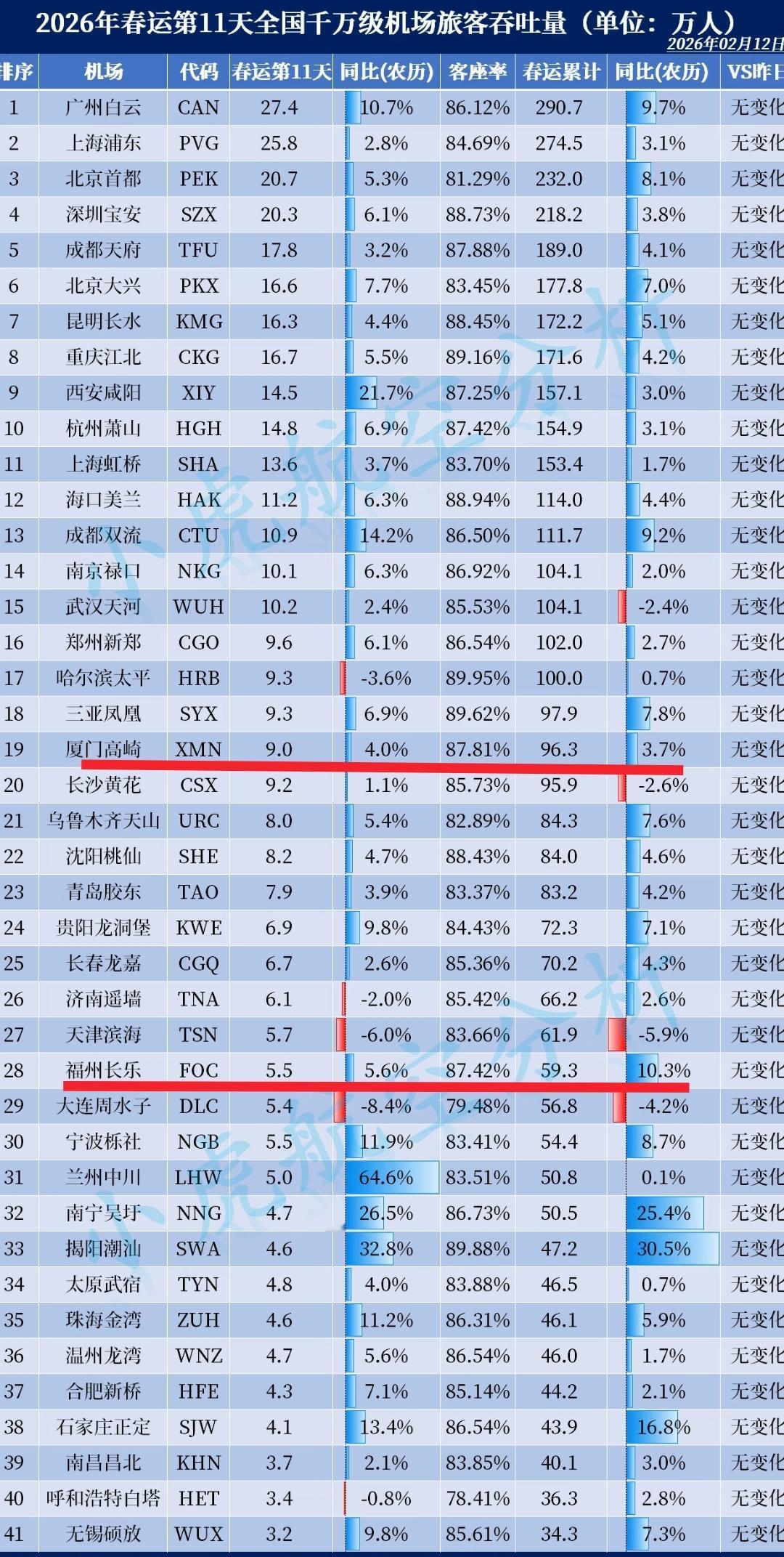 春运这几天厦门高崎机场客流量96万人次,福州机场客流量59万人次,看到此情此景让人感觉到不可思议。 本身福州的常住人口数量就比厦门多,而且福州机场还有地铁,可即便如此福州机场客流量依然逊色于厦门。 见此情景只能说明泉州、漳州来厦门坐飞机的人实在太多了,相比之下来福州机场坐飞机的宁德、莆田旅客数量相对就会少一些,因此就会出现这种场景。