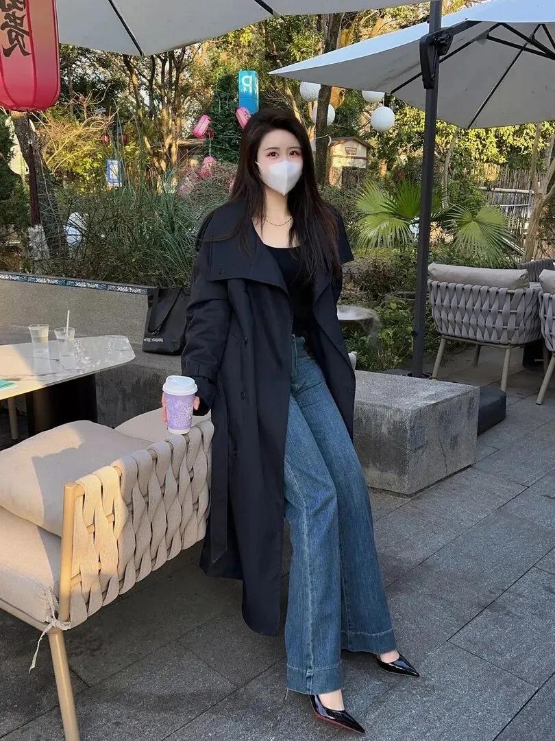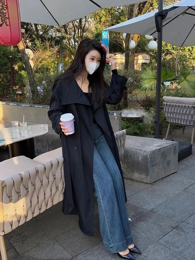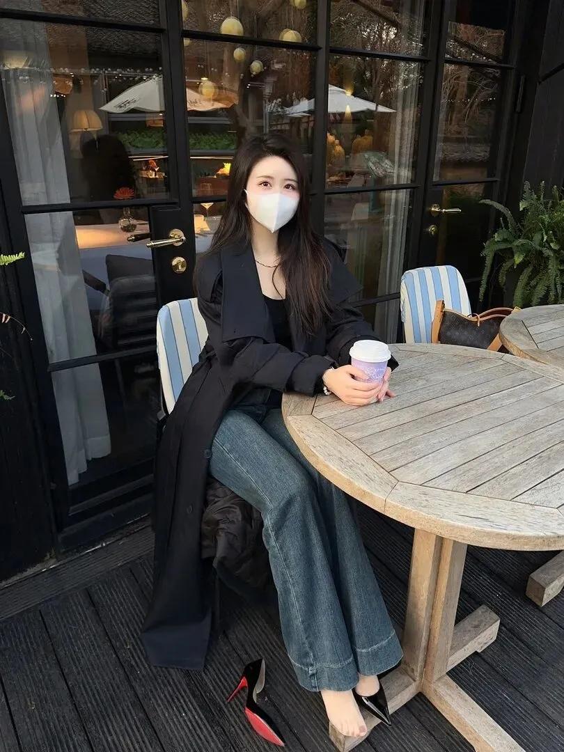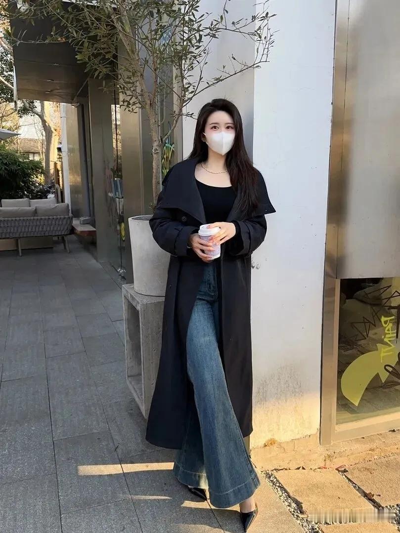 黑色大衣搭配牛仔裤,简约又时尚,手拿咖啡,享受悠闲时光。