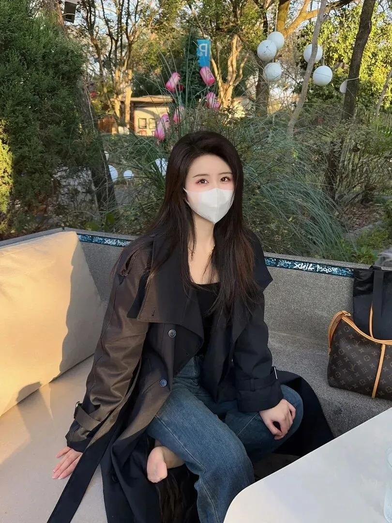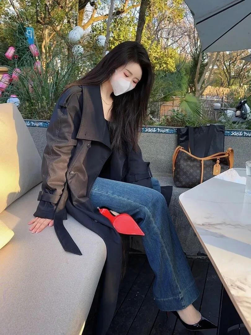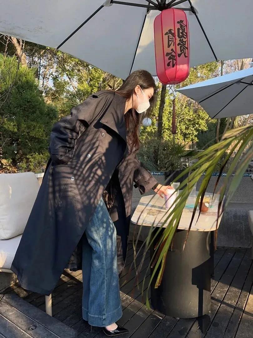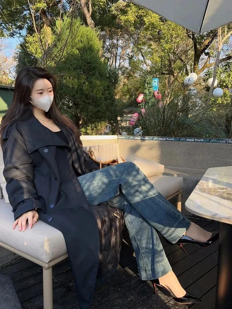 黑色大衣搭配牛仔裤,简约又时尚,手拿咖啡,享受悠闲时光。