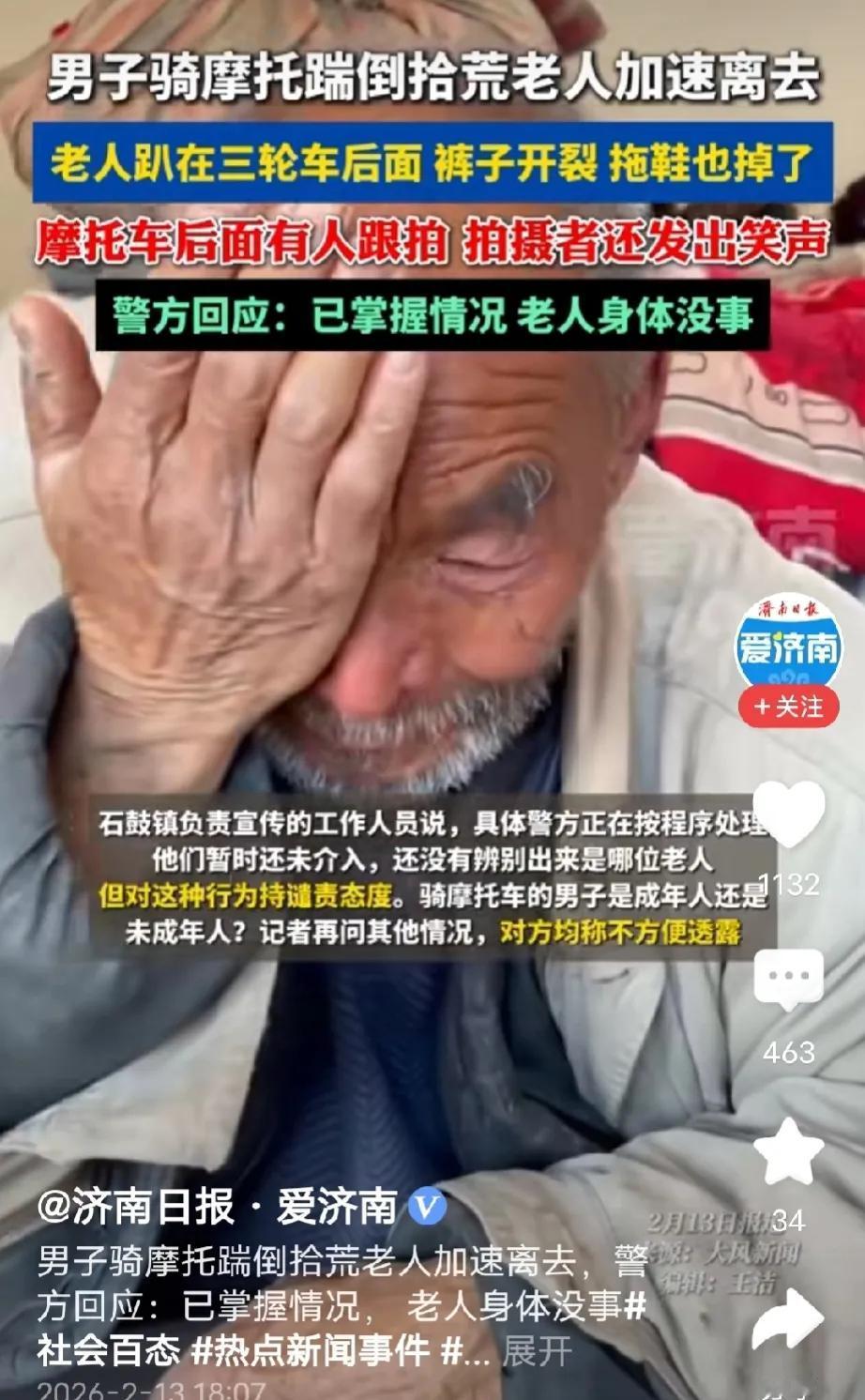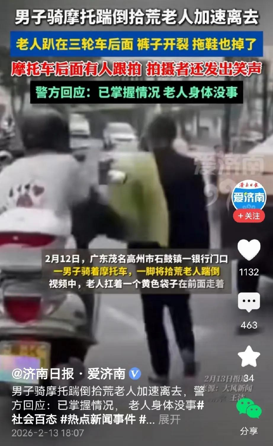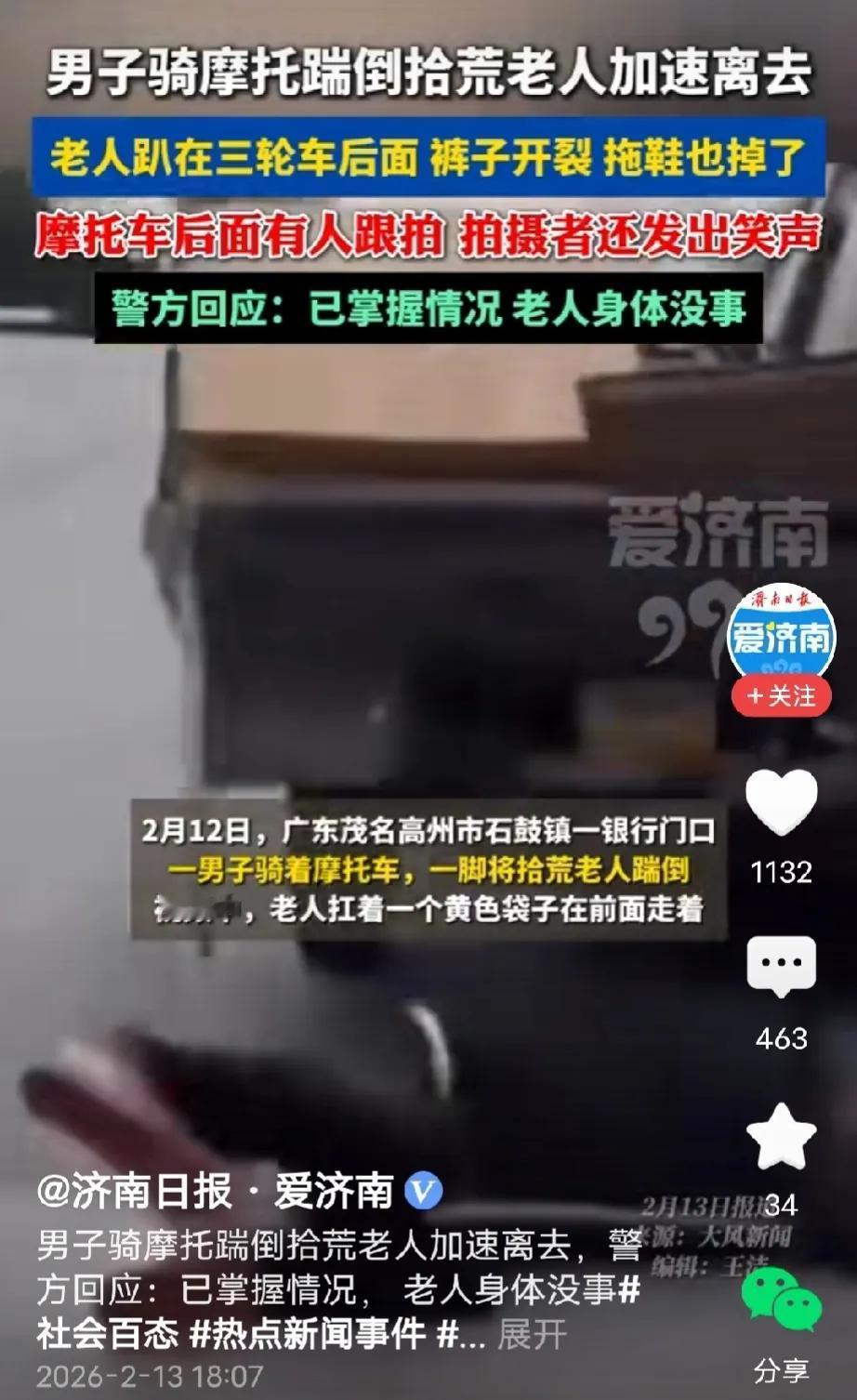 令人发指!广东茂名,一男子骑摩托车尾随拾荒老人,趁其不备一脚把老人踹倒在三轮车底下,老人倒下后裤子开裂,拖鞋被踹飞脱。男子身后还有人骑车跟拍、狂笑。男子把老人踹倒后加速逃离现场。网友:天生的坏种。 2月12日广东茂名,一银行门口,一个身穿黑色衣服的拾荒老人,身上背着一个编织袋慢悠悠地走在路上。 老人是靠着路边慢慢走的,没有招谁惹谁,也没有挡道。 突然,一个骑着摩托车的男子慢慢靠近老人,他趁老人不备直接一脚狠狠踢到老人后背。 毫无防备的老人硬生生被他踹倒在路边停着的三轮车底下,老人倒下后裤子开裂,拖鞋也飞脱了。 男子踹倒老人后加速逃离现场,更可恶的是男子身后还有人骑车跟拍,看到老人倒下后后面骑车的人还发出刺耳的狂笑。 这一前一后的,不知道是同伙还是路人,但不管是同伙、还是路人就凭他跟拍、狂笑就知道不是什么好人。 而老人被踹倒在地后,本想直接爬起身,却因为年老体弱,身子不利索,折腾了很久才能站起来。 老人身子单薄,消瘦,毫无防备被人这么一踹肯定很疼。 按理像老人这个年纪,本该是安享晚年,在家好好休息,可他为了生活还在奔波,本就可怜。 可骑摩托车男子不但没有可怜同情老人,还使坏,绊倒老人。 这种行为简直丧尽天良、毫无人性!老人本就瘦弱可怜,靠拾荒艰难谋生,安分守己、不惹不闹,却在毫无防备的情况下,被骑摩托男子从背后狠狠一脚踹倒,摔在三轮车下,裤子开裂、拖鞋飞脱,挣扎许久才勉强站起。 施暴者不仅不心生愧疚,反而加速逃离,冷漠至极。 更令人发指的是,身后跟拍者不仅不制止恶行,反而全程录像、放声狂笑,把伤害老人当作取乐的笑料,毫无底线与良知。 一个动手施暴,一个冷眼起哄、拍手叫好,两人都是恶意的帮凶。 对弱者下手、以欺凌为乐,既缺德又违法,必须受到法律严惩和全社会谴责。这种冷血自私、欺软怕硬的人,不配得到任何宽容! 他这种毫无人性的恶行,不仅突破道德底线,更已经触犯法律,必须依法严惩。 依据《治安管理处罚法》第26条规定,随意殴打他人、寻衅滋事的,处五日以上十五日以下拘留,可以并处罚款。 在这起事件里,老人只是正常拾荒谋生,没有任何过错,男子却故意从背后猛踹老人,导致老人摔倒,这种行为就是典型的随意殴打他人、寻衅滋事。 他专门欺负弱小老人,还事后逃跑,主观恶意非常大,情节十分恶劣。 而后面跟拍的人,明明看到有人伤害老人,不仅不制止,还录像狂笑、起哄取乐,和施暴者一唱一和,属于共同违法,并不是单纯看热闹。 两人一个动手伤人,一个纵容作恶,既违背道德良心,也触犯了法律,必须依法严肃追究责任,才能维护社会公平正义。 这个事发生后有人报警,目前警方已经介入,并做出回应:已经掌握情况,老人身体没事。 对于这件事,广大网友怎么看?