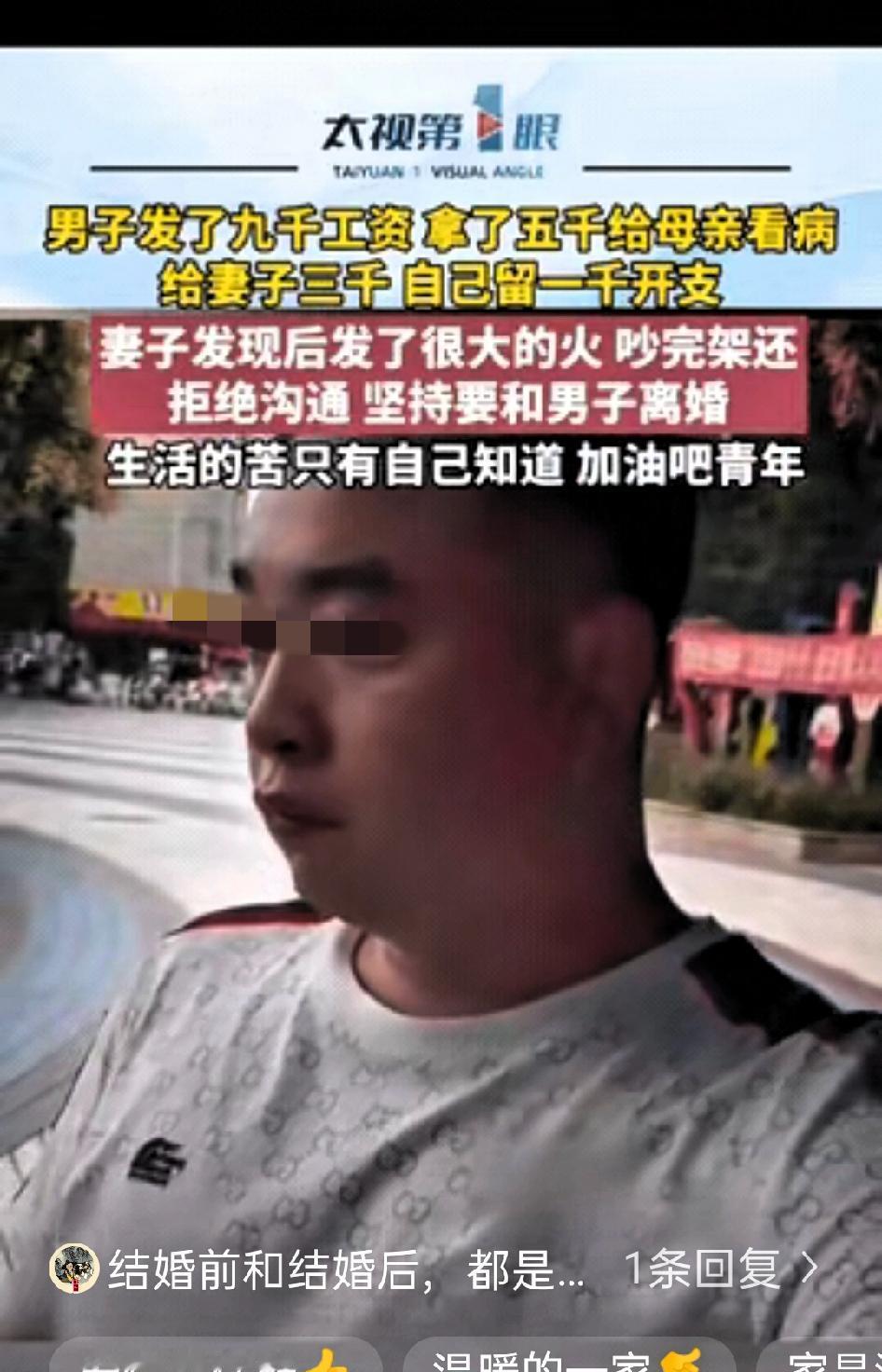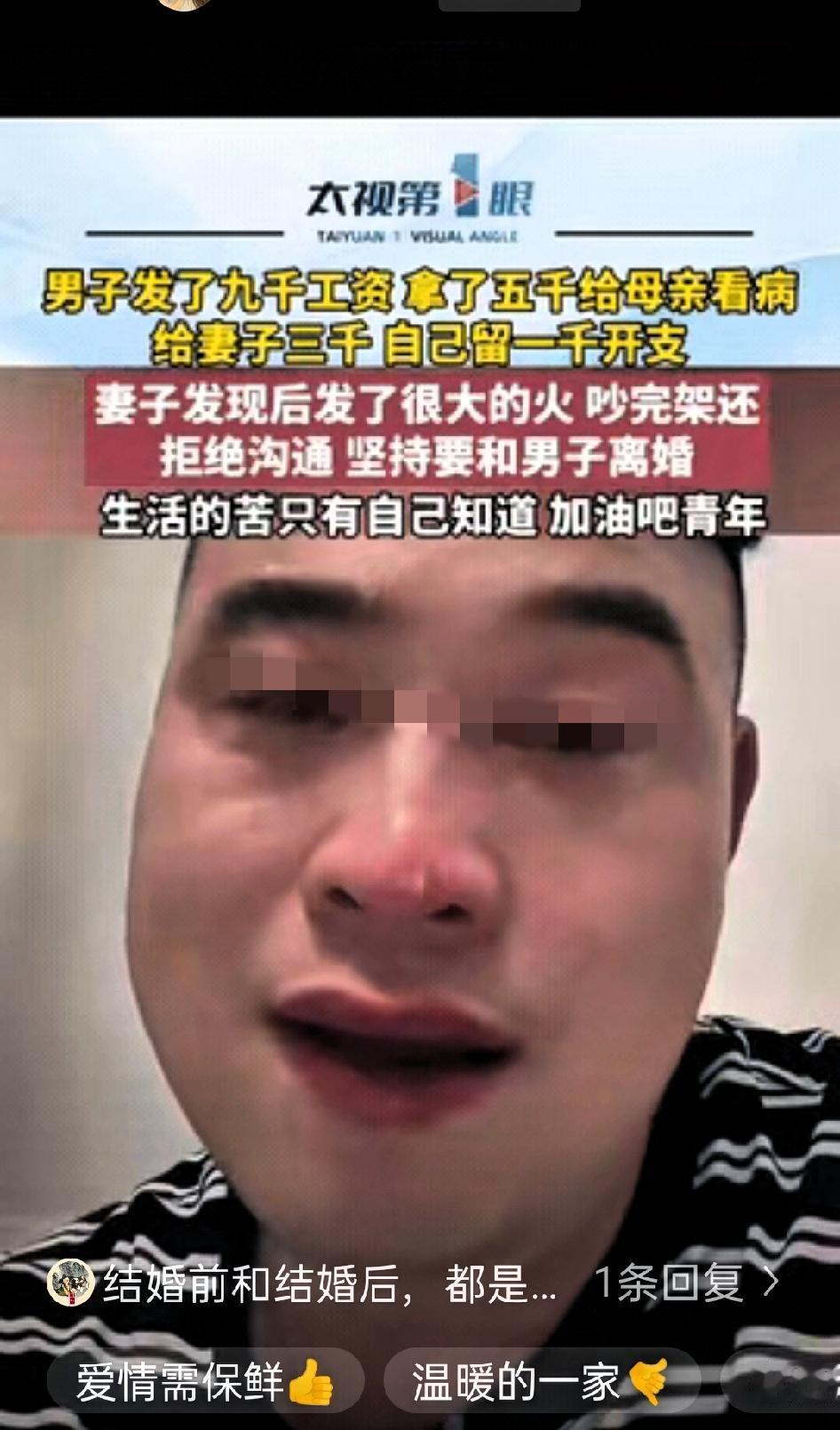“男儿有泪不轻弹,只是未到伤心处!”四川一名男子月薪9000元,得知母亲生病后,他转了5000元给母亲看病,留下3000元作为家庭开支,自己仅留1000元生活费。 因为事情紧急,他没有提前和妻子商量,没想到妻子知道后十分生气,甚至提出离婚。 男子心里十分委屈,他难过的不是支出这笔钱,而是自己作为子女,为生病的母亲尽一份孝心,却得不到最亲近的人的理解。在他看来,父母养育自己长大,生病时出钱治疗是理所应当的责任,他原本以为妻子能够体谅,结果却换来指责。 夫妻之间,遇事沟通确实很有必要,但在家人突发疾病这种紧急情况面前,先解决问题,也在情理之中。男子并没有乱花钱,也没有忽视家庭生活,只是优先处理了长辈的健康问题。 一段稳定的婚姻,离不开互相理解与包容。日子是两个人一起过的,双方的父母都需要尊重和照顾,遇到事情不是先计较得失,而是学会换位思考。你理解我对家人的牵挂,我体谅你对家庭的用心,这样才能把日子过安稳。 钱不够可以再挣,可人心一旦凉了,就很难再挽回。婚姻里最难得的不是物质富足,而是彼此有同理心,懂得善待对方的至亲。 百善孝为先,孝顺本就是做人的基本底线,也不该成为婚姻里的矛盾导火索。男子的做法,虽在程序上少了一步提前商量,但出发点是责任与孝心,并无大错。 这件事也让很多人反思,夫妻之间该如何平衡小家庭与双方父母的关系。