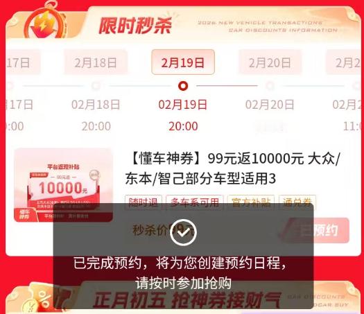 预计春节有数十亿红包可抢原来这才是年轻人的电子年味回家这几天为了躲开对于我结婚、工作、收入的各种盘问,我觉得开启我另一项事业——抢红包,字节、腾讯、百度、微博……我雨露均沾,尤其是这个可以抢万元的懂车神券——但买车先买券哈,一直到2月23号,每天都有——我已经全都预约了,因为不知道到时候哪个水龙头有水啊,能抢到一个算一个哇~