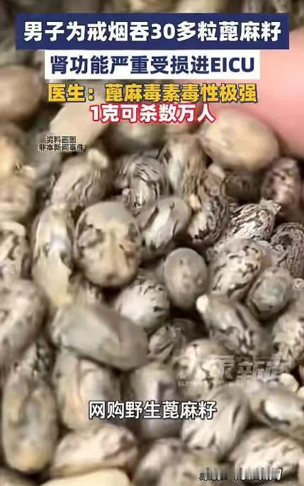 “悲剧还是发生了!”浙江,一男子为了戒烟,轻信“土法子”,竟一次性吞了30多粒蓖麻籽,结果就出现了剧烈呕吐、腹泻的情况,甚至还排不出尿!家人将他送医检查后,发现男子肾功能已严重受损,后被紧急送入重症监护室! 浙大一院急诊重症监护室的生命体征监护仪上,波形图正不知疲倦地跳动。这不是电影里的场景,而是刚刚发生的生死竞速。 躺在病床上的刘哥(化名),恐怕做梦都想不到,自己只是想在这个钱难挣的年头省点买烟钱,结果却不得不让身体去硬扛那份比氰化物还要毒上6000倍的凶险。 就在这几天,刘哥一口气吞下了30多粒网购的野生蓖麻籽。你没看错,是30多粒。在毒理学的冷酷账本上,这个数字足以让人头皮发麻。要知道,蓖麻毒素的凶狠程度是有机磷神经毒剂的385倍,仅仅2到6颗未经处理的种子,就足以把一个成年人送进坟墓。 刘哥摄入的剂量,踩过了致死警戒线足足五倍有余。这事儿说起来既荒诞又让人唏嘘。刘哥是个有着20年烟龄的老枪,前几年家里怎么劝都不听,总觉得那是生活中唯一的乐子。 可这两年经济大环境大家都有数,手头一紧,这烟钱就显得烫手了。悲剧的伏笔是在一次聚餐时埋下的。酒桌上,亲戚的朋友拍着胸脯打包票,推销了一个所谓的“土方子”:生吃野生蓖麻籽,包治烟瘾,绝对管用。 在这个信任极其廉价的社交场域里,刘哥甚至没动哪怕一秒钟的脑子去查证,就全盘照收了。快递一到,他就像抓住救命稻草一样,把那30多颗带着花纹的种子全咽了下去。 灾难来得极快。没过几个小时,蓖麻毒素开始在他的消化道里肆虐。剧烈的呕吐和腹泻接踵而至,他在厕所和床之间往返了二三十次,整个人几乎虚脱。 最致命的误判就在此时发生。刘哥非但没有求救,反而产生了一种诡异的欣慰感——他以为这是“药效”上来了,身体正在排毒,正在和烟瘾做了断。 这种对“好转反应”的迷信,直接切断了他早期自救的黄金窗口。直到腰部传来剧痛,甚至完全尿不出来这是肾脏功能彻底停摆的信号此时的他已经半只脚踏进了鬼门关。 当他被家人火急火燎送进浙大一院时,急诊科主任陆远强带领的团队面对的是一份糟糕透顶的检查报告:急性肾衰竭,多脏器受损风险极高。 无独有偶,就在刘哥隔壁床位,还躺着一位63岁的李伯。如果说刘哥伤的是“下路”,那李伯就是彻底乱了“上路”。因为摔断了肋骨,李伯也不信医院信偏方,网购了八角莲配三七粉,甚至豪迈地吞了一大勺。 结果怎么样?鬼臼毒素直接攻击了神经系统。这个平时乐呵呵的老人,突然开始满嘴胡话,喊着“有鬼要抓我”,甚至挥舞四肢攻击家人。血液化验显示,他体内的鬼臼毒素浓度达到了0.073ug/mL。 为了把这两个从死神手里抢回来,浙大一院的医疗团队几乎动用了所有的重武器。对李伯,是连续的血液灌流和血浆置换,相当于把他全身的血“洗”了一遍。对刘哥,则是EICU里的全天候护肝、肾脏替代治疗。 万幸的是,现在的医疗技术足够硬核,两个人的命最终是保住了。这一场折腾下来,不仅身体遭受了不可逆的微观损伤,光是EICU里那如流水的治疗费用,恐怕够刘哥抽上好几年的高档香烟。 陆远强医生的话说得很重,但句句在理:并没有什么神奇的民间炼金术能让你绕过科学规律。那些在酒桌上被吹得神乎其神的“土方子”,本质上是一场拿命做赌注的俄罗斯轮盘赌。 无论是想治骨折还是想戒烟,任何试图走捷径的行为,最终都要由身体支付最高昂的利息。 别再拿自己的肾脏和神经去验证那些几百年前的谣言了,这真的是在玩命。