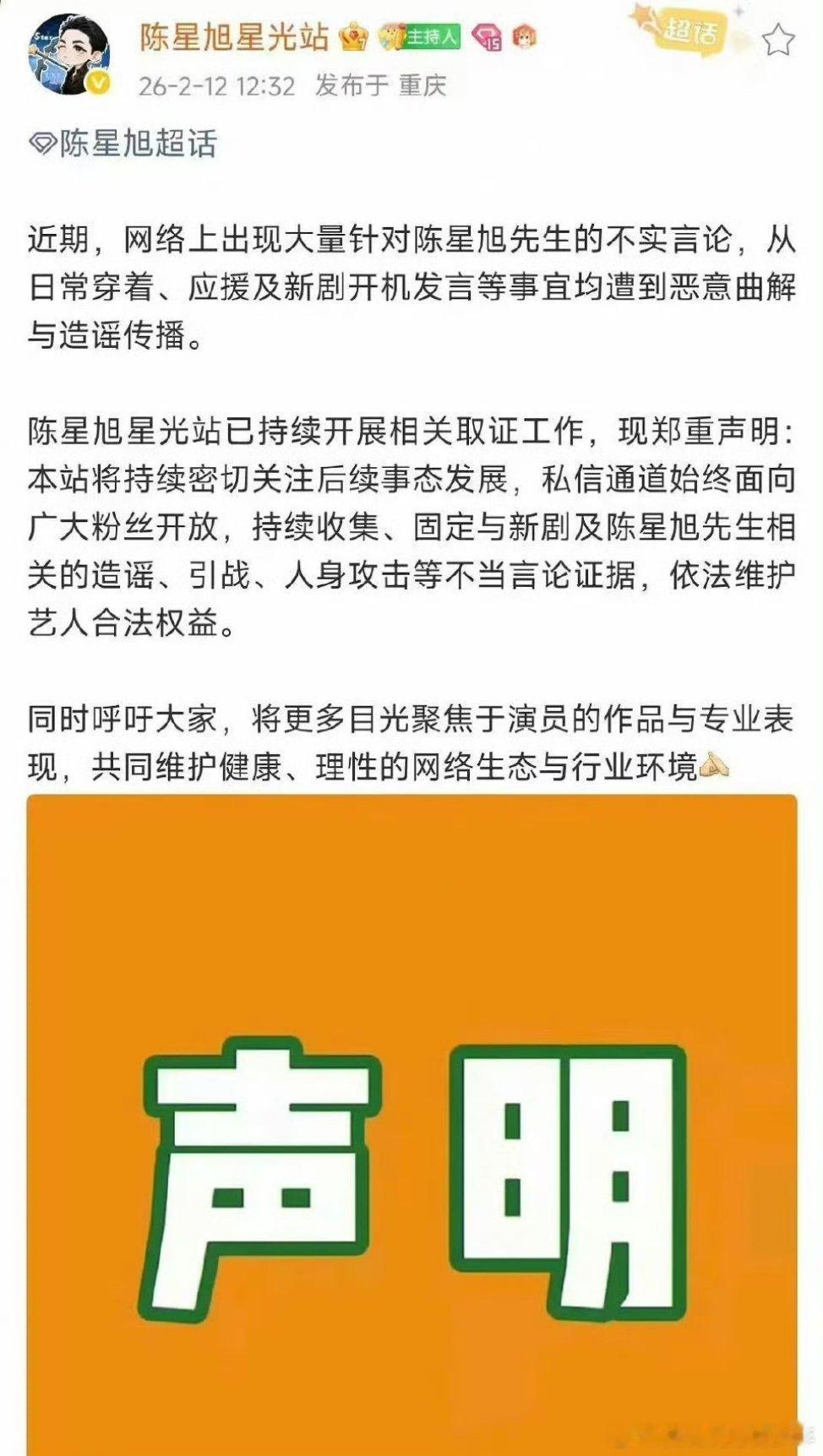天亮了~陈星旭方发声明了,支持陈星旭依法维权拒绝跟风恶意嘿!支持陈星旭维护自