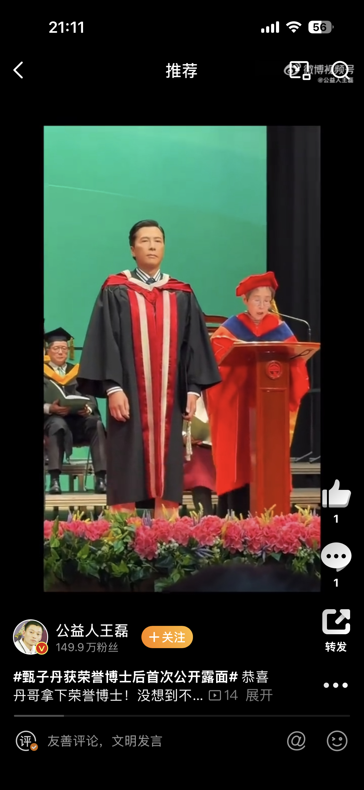 丹哥获得荣誉博士后首次露面参加活动!丹哥热情与粉丝对话,“这次要打十一个,打到老”!很喜欢他的电影,希望继续创作更好的作品出来啊!甄子丹获荣誉博士后首次公开露面甄子丹称现在还可以打11个