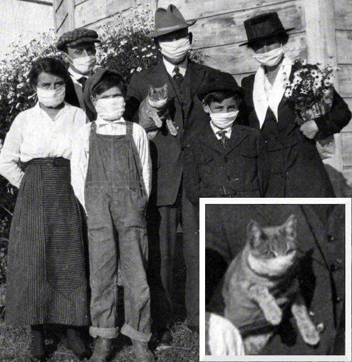 国外流感期间的全家照,防护意识很强,猫咪也戴了口罩
