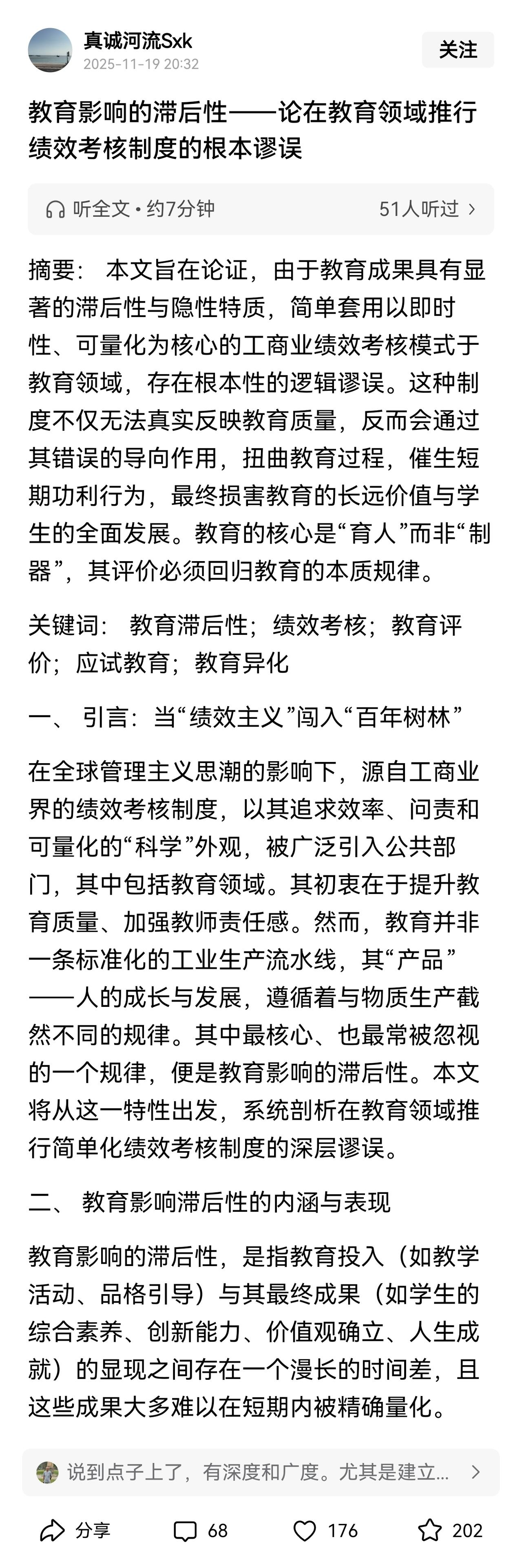 早在中小学推进绩效考核,实行绩效工资制度时,就有很多反对之声,认为这会导致教育功利化、短视化。可以说,所有关于绩效考核会带来的教育问题,都一一被验证。 支持绩效考核者认为,如果不考核绩效,干好干坏一个样,不是养懒人吗?这忽视提升教师的职业荣誉感和成就感。当前教育内卷、教师职业倦怠感加剧,恰恰是因为绩效考核本就不该用于教师评价。 年薪制(年薪随教龄增加而增加)、教师同行评价,才能既保障教师待遇,又促进教师职业化、专业化发展。