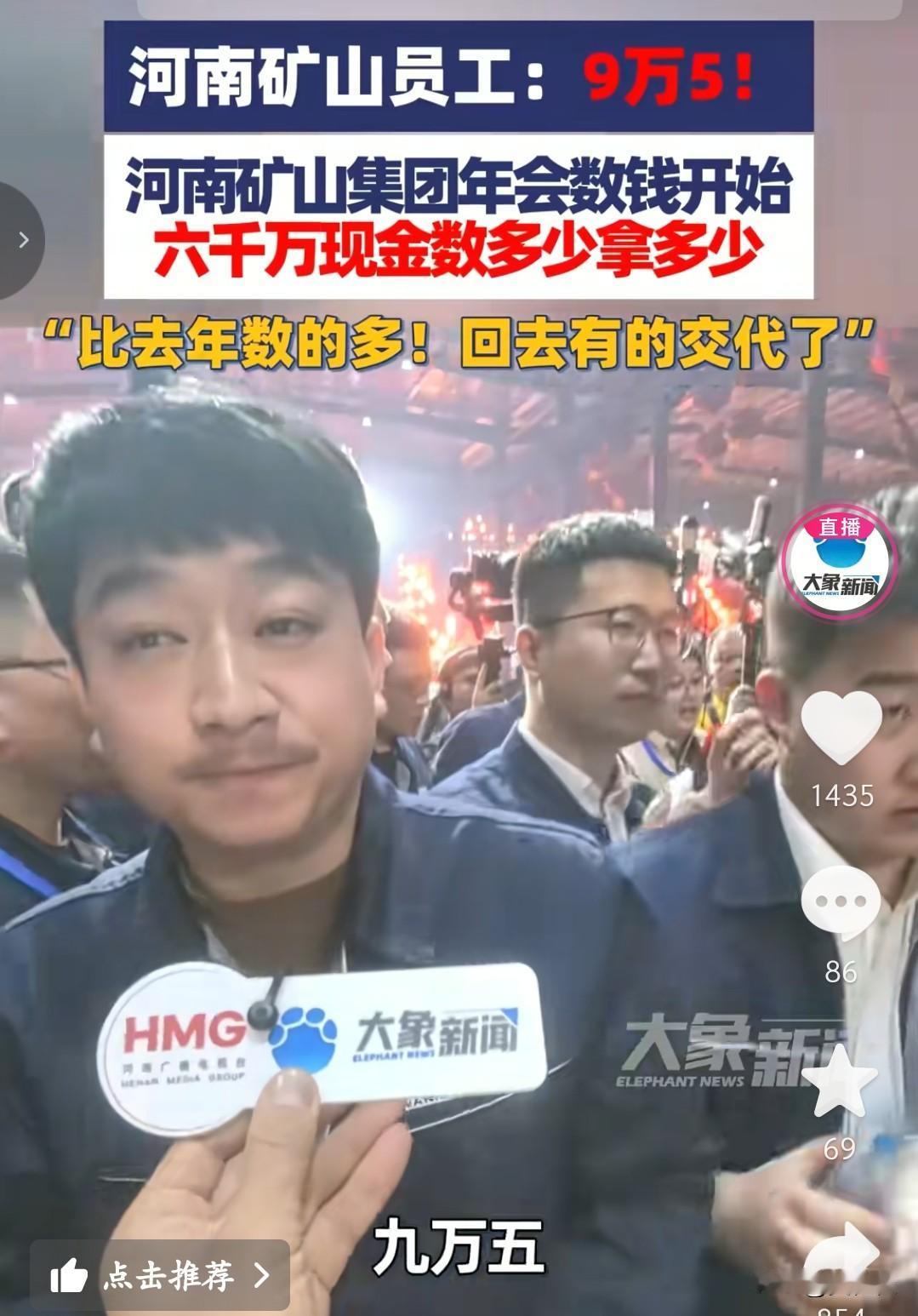 数钱数到手软!河南矿山年会现场,太羡慕了! 2月13日,河南矿山起重机有限公司的年会直接刷屏了。现场6000万现金堆成山,40台点钞机同时开工,员工代表上台参加数钱比赛,5到15分钟内数多少,整个班组就能平分多少。 有员工代表5分钟数了5万,班组平分;还有人10分钟数出约9.6万,笑着说“比去年多,回去能交差了”。今年公司年终奖总额超1.8亿,占去年2.7亿利润的三分之二,7000多名员工和家属齐聚800桌宴席,屠洪刚等艺人现场献唱,场面热闹又震撼。 面对“作秀”的质疑,老板崔培军直接回应:“嘴长别人身上,我对得起自己的良心就行。我不玩抖音,不带货,也不想当网红。从2004年就开始发现金,拿在手里的钱是实实在在的,比打在卡里有温度。”这样的年终奖,谁看了不羡慕“别人家的公司”!