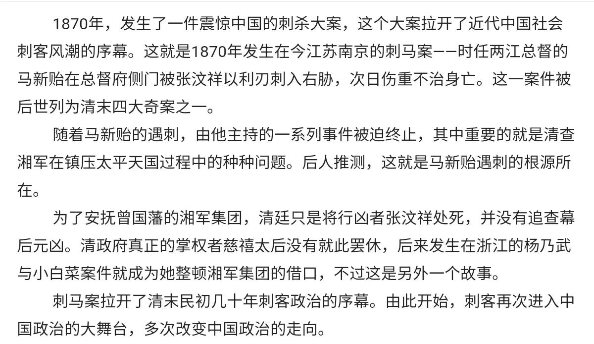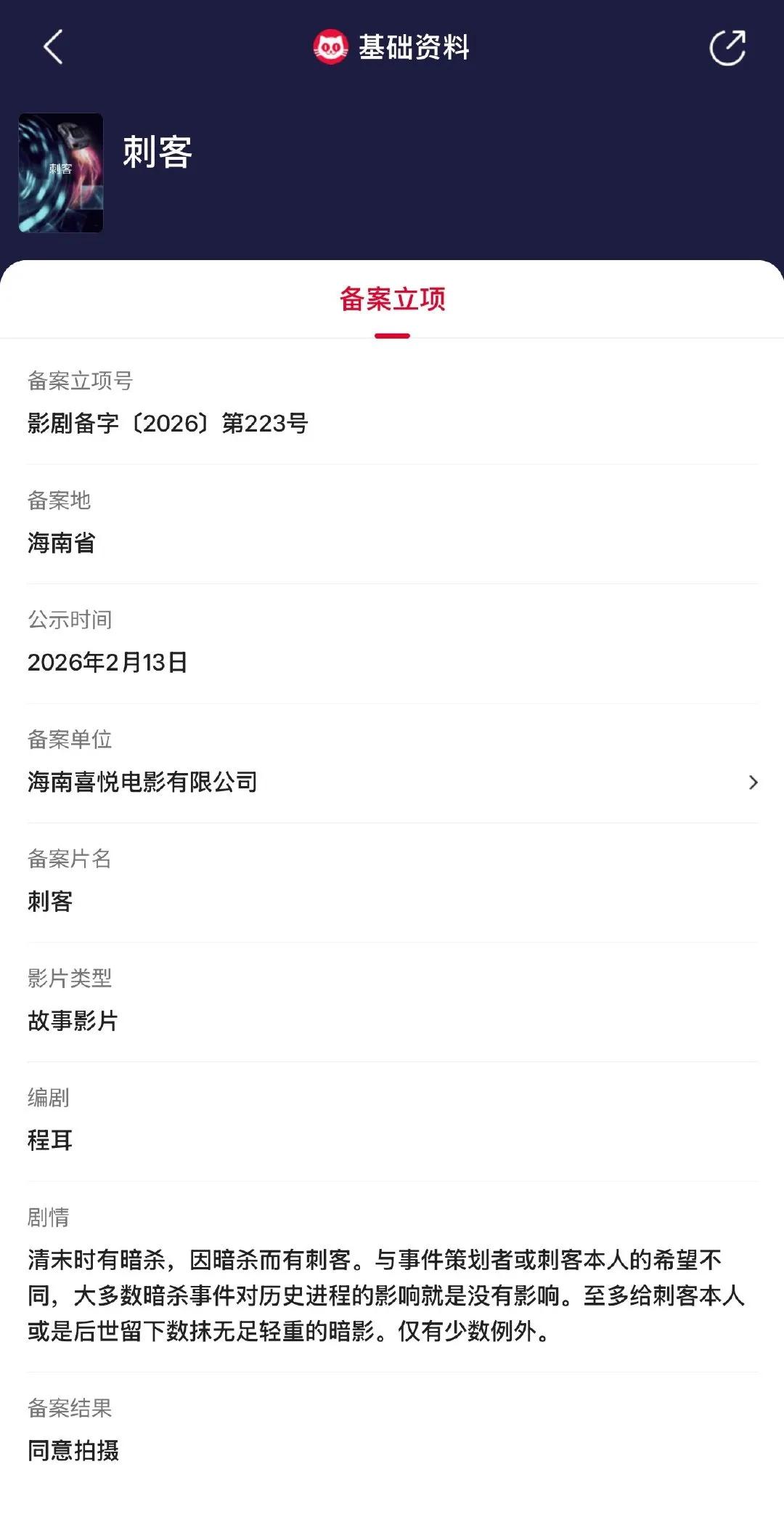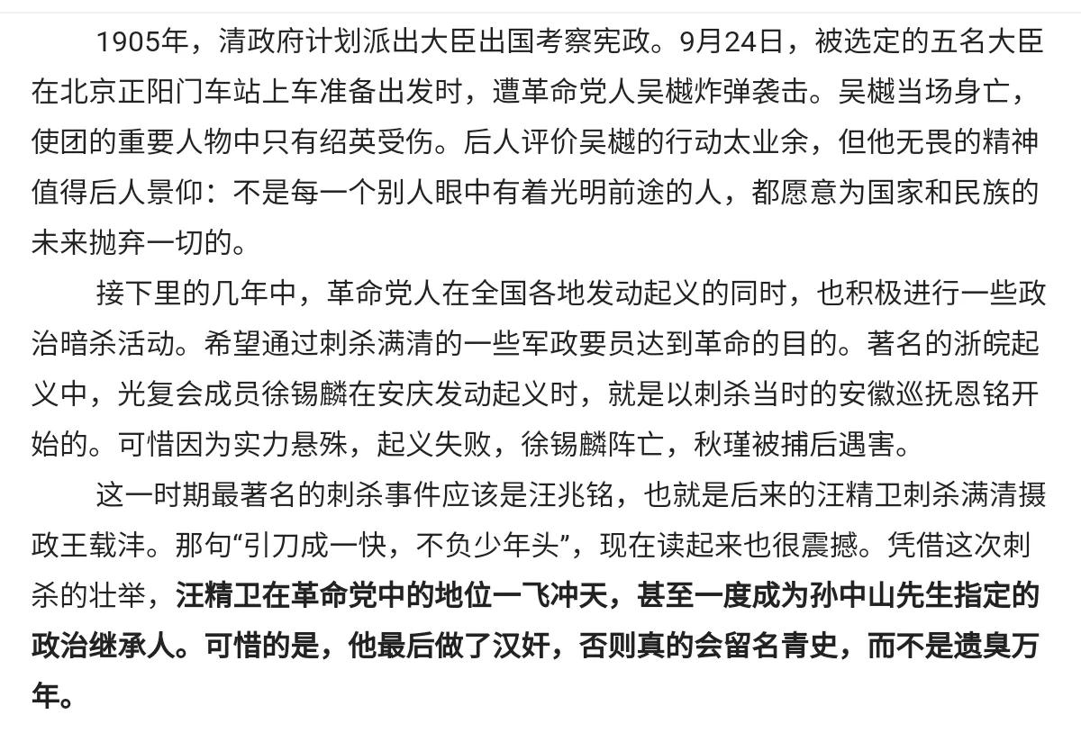 新电影《刺客》梗概是程耳的文笔。非常好奇,会是什么历史事件?“仅有少数例外”,那就是说对历史进程有影响了?查了一下,清末的刺杀事件著名的且对历史进程造成大的影响的有: 1.1907年7月6日,光复会领导安庆起义,徐锡麟刺杀安徽巡抚恩铭。 2.1910年汪精卫刺杀满清摄政王载沣。 3.1912年蒋刺杀光复会首领陶成章 4.1913年3月,宋教仁被刺杀。 其中,后三个事件对历史进程的影响更大。不过如果拍宋教仁事件,主角侧重在宋,而不是刺客了。 那剩下的两个事件,刺客都是后来搅动历史风云的人物。相比之下,蒋比汪更符合刺客,因为汪没有直接动手。