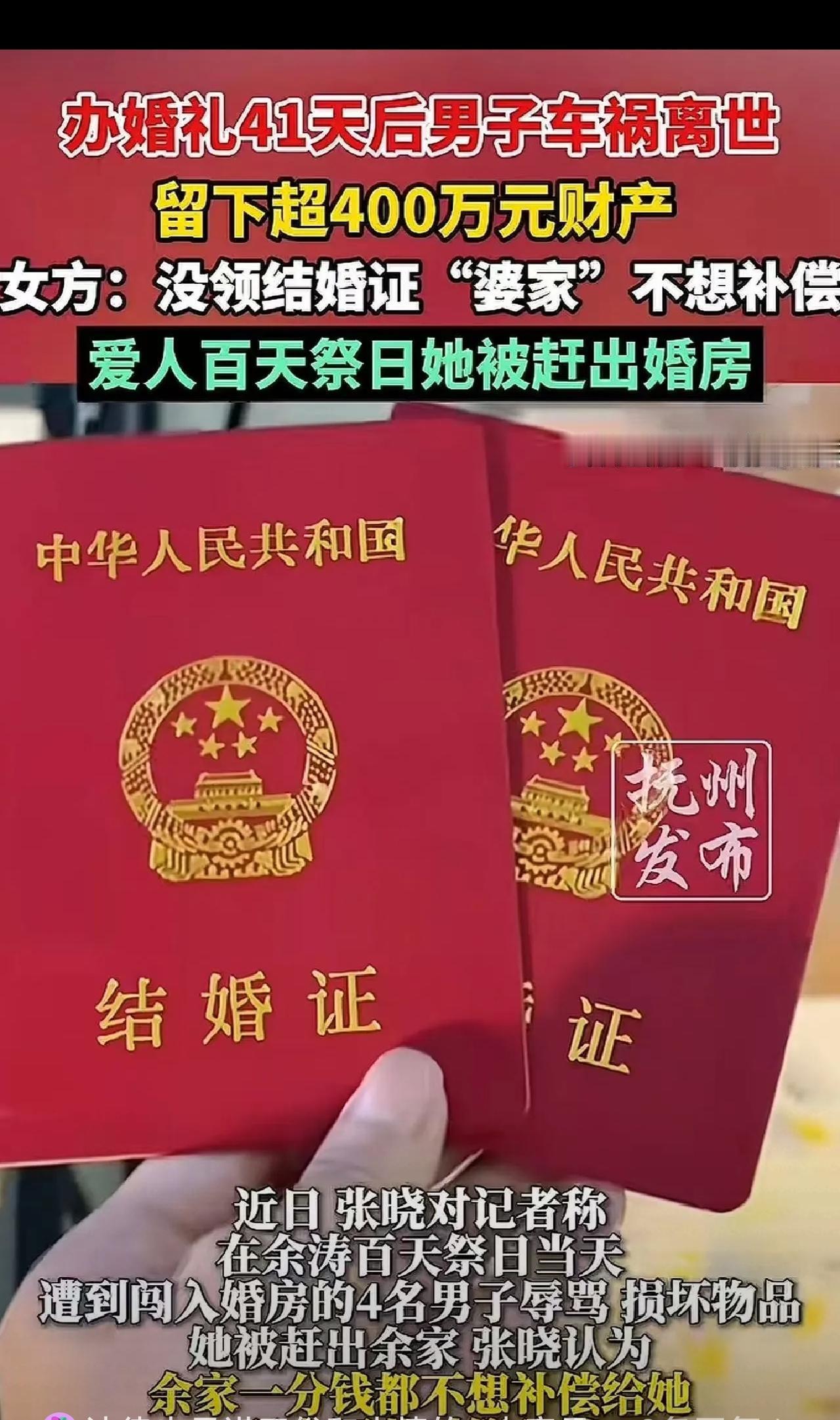 “这就是人性!”山西朔州,31岁女子和老公结婚后发生了夫妻关系,但没领证,41天后,老公车祸死亡,女子以妻子身份端灵,抱骨灰盒,打砂锅,不料,男子400万遗产全被婆婆拿走,女子一分没有拿到! 31岁的张晓,和丈夫余涛办了全村皆知的隆重婚礼,两人早已在北京同居半年,工资混着花、财产一起理,就等着520这个好日子去领结婚证,却因余涛临时调岗,领证的事一拖再拖。 谁也没料到,这场婚礼刚过41天,悲剧就发生了——余涛骑摩托车上班时,被失控大货车撞飞,永远离开了她。 张晓强忍撕心裂肺的悲痛,以妻子的身份守灵七天、抱骨灰盒、按当地习俗完成打砂锅、摔瓦盆所有仪式,婆婆更是亲手给她披上孝衣,当众认下她这个余家儿媳。 可葬礼的烟火刚散,所有温情瞬间化为利刃! 余涛的300多万车祸赔偿、两人共同存款、房产出资,总计超400万的财产,被婆婆第一时间转空、全部占为己有,连张晓垫付的7万多元医疗费,对方提都不提。 更绝情的还在后面:百日祭当天,张晓被四名壮汉强行拖出婚房,婆婆不仅翻脸不认人,还一纸诉状将她告上法庭,要求返还49.7万彩礼,理由只有一句:没领证,就不是我家儿媳! 张晓抱着丈夫的遗像,在村口崩溃哭喊:让我端灵送终时,我是堂堂正正的妻子;轮到分财产了,我就一文不值了? 这事一出,全网直接炸锅,网友吵成两极: 🔥力挺张晓的网友:办婚礼、同居、尽了妻子所有义务,全村人都作证!先用传统习俗绑着她尽孝送终,转头用法律抢财产,这家人吃相太难看,简直是道德绑架! ⚖️站法律角度的网友:民法典早就不承认事实婚姻了,没领证就没有法律上的夫妻关系,遗产本来就归母亲继承,只能说女生太天真。 💬中立网友:法律是底线,道德是良心!这家人是踩着法律的空子,丢了做人的底线,太让人寒心了! 在我看来,这件事最伤人的根本不是领没领证,而是一场赤裸裸的双标算计! 需要她撑场面、尽妻子义务、完成丧葬礼仪时,就搬出传统习俗,认她是余家媳妇;等到涉及百万财产,立刻掏出法律条文,把她踢得干干净净。 张晓错在太相信“仪式等于承诺”,把真心托付给了凉薄之人;而余家的恶,在于把人情当工具,把利益当唯一,先用伦理榨干她的情感付出,再用法律剥夺她的所有权益。 最讽刺的是,她披麻戴孝为夫送终时,全村人都夸她重情重义;可当她想拿回属于自己的财产时,却被贴上“贪心图钱”的标签。 一场风光的婚礼,给不了一辈子的保障;一句口头的认可,护不住真心的付出。 永远别让你的真心,变成任人拿捏的软肋!