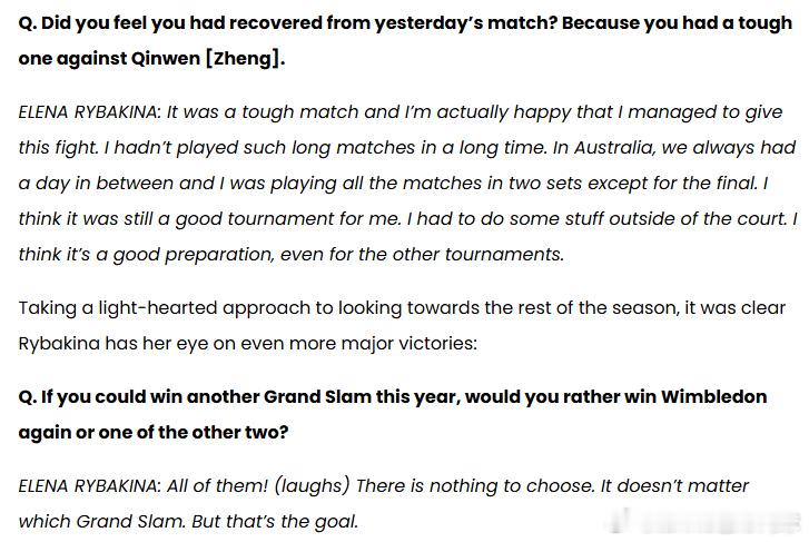 多哈昨天和姆博科打完1/4决赛后,莱巴金娜接受了短暂的采访: