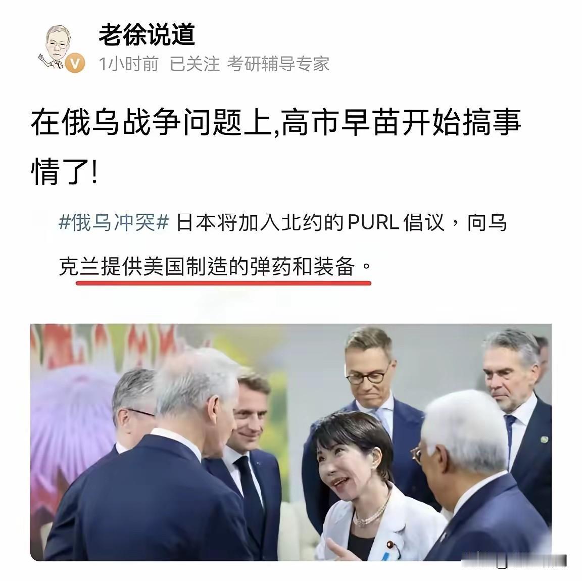 京城老徐批高市:开始在俄乌战争问题上搞事!加入北约PURL倡议,出钱买美国武器装备,提供给乌克兰! 老徐这句话,令本人想起一消息:日本援乌资金已达160亿美元,最近决定再拿60亿。老徐说的就是这次吗? 本人上一篇小文,说到特朗普访日,高市向其表达拥核愿望,老特竟一反常态默许!是否与俄乌战争有关呢? 苍狼想问的是:高市再次大手笔援乌,是投川普所好,讨北约欧盟欢心,赢得更大市场?还是坚守文明正义? …………