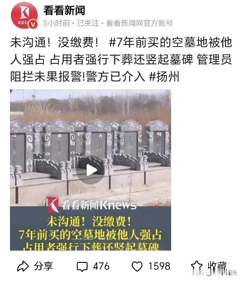 “太嚣张!”江苏扬州,一男子岳父母80多岁,为了让老人安心,子女花5000元买了块墓地,万万没有想到,六七年后,子女突然发现,墓地被人强行占用,还竖了墓碑,管理员表示,占墓地的是附近村民,他尽力阻止,差点和对方打了起来,可挡不住,管理员报警,警方赶到,村民要出钱买下墓地,老人坚决不同意,墓园已经没有可调换的墓地。 李先生的岳父岳母都已年过八旬,老两口一辈子风风雨雨,到了晚年,子女们也开始为他们的身后事操心。 2019 年,考虑到老人年纪大了,子女们觉得提前选好墓地能让老人安心,也避免日后手忙脚乱。 于是,一家人来到扬州市的一处墓园,在墓园里精心挑选了一块环境清雅,位置合适的墓地。 当时,子女们毫不犹豫地花 5000 元将这块墓地买了下来,还和墓园签订了协议。 协议签好,儿女收好了购买单据,他们以为,这样就能让老人安心,也了却了他们的一桩心事。 此后几年,一家人生活平静,老人身体健康,那块墓地一直空着。 但是既然买下,使用权已经有了归属,墓地静静的等待,未来有一天主人会住进去。 可万万没有想到,李先生和家人去墓园看时,他们震惊发现,原本空着的墓地被别人占了,上面竖起了崭新墓碑,一看就是最近的事情。 李先生又惊又怒,立刻找到墓园管理员询问情况,管理员一脸无奈,他告诉李先生说,占用墓地的人是横行霸占,一句话没说,就把墓地占了。 占墓地的人没有提前和管理处沟通,也没有缴纳任何费用,他们在下葬当天,管理员发现后就极力阻止。 当时双方情绪激动,管理员挡了又挡,还是挡不住对方的强行下葬。 他们硬是强占了墓地,管理员为了阻止,还差点和对方发生肢体冲突。 可对方态度强硬,根本不听劝阻,最终还是完成了下葬,管理员见劝阻无果,赶紧拨打报警电话。 警方来后,占用墓地的一方表示,他们愿意花钱买下这块墓地,可李先生一家哪会同意,先不说这墓地是他们多方观测,精心挑选的风水宝地。 并且,他们早已经购买好的,老人这么多年,安心的静待有一天会入住进去。 家里的老人得知此事后,心里难过,虽说那是一块墓地,但是,他们早就将墓地看做是百年之后的归宿。 老人态度坚决,坚决不同意将墓地转让出去,并且,墓园现在已经没有空余的墓地。 这样一来,让李先生一家陷入了两难,老人忧心忡忡,每天都睡不安稳。 当地相关部门得知此事,十分重视,立即派人前往调查。 原来,强行占墓地的是附近村民,他不知从何处得知这块墓地是空着的。 他便自作主张将逝去的亲人安葬在了这里。 李先生认为,这是无妄之灾,我们什么都没做,却遭遇了这样的事情。 老人在家寝食难安,他们的权益受到了严重侵害,他们购买墓地的手续齐全,墓园也有责任管理好墓地。 如今事已至此,总不能任由村民无法无纪,随意强占别人家的墓地。 目前,当地警方已经介入调解,希望此事能够圆满解决,保护好老人的权益,让老人安心,不再忧虑, 《民法典》第1165条规定: 行为人因过错侵害他人权益造成损害的,应当承担侵权责任。 李先生一家与墓园签订的墓地买卖合同合法有效,已经依法取得该墓地的使用权。 村民明知墓地归属他人,仍然未经沟通,未付费便强行下葬,明显存在主观过错,直接侵害了李先生一家的墓地使用权,同时也对老人造成了JS损害。 村民应立即停止侵害,排除妨碍,恢复李先生家墓地的原状。 墓地对老人而言,是具有人身意义的“身后归宿”,强占行为导致老人受到了打击,李先生一家有权主张js损害赔偿。 墓园未尽到管理义务,导致已售出墓地被侵占,违反了合同约定。 李先生可要求墓园承担相应的责任。 目前警方已经介入调解,希望能有圆满的结果,让老人安心,后续如何,拭目以待。 对此,你怎么看?