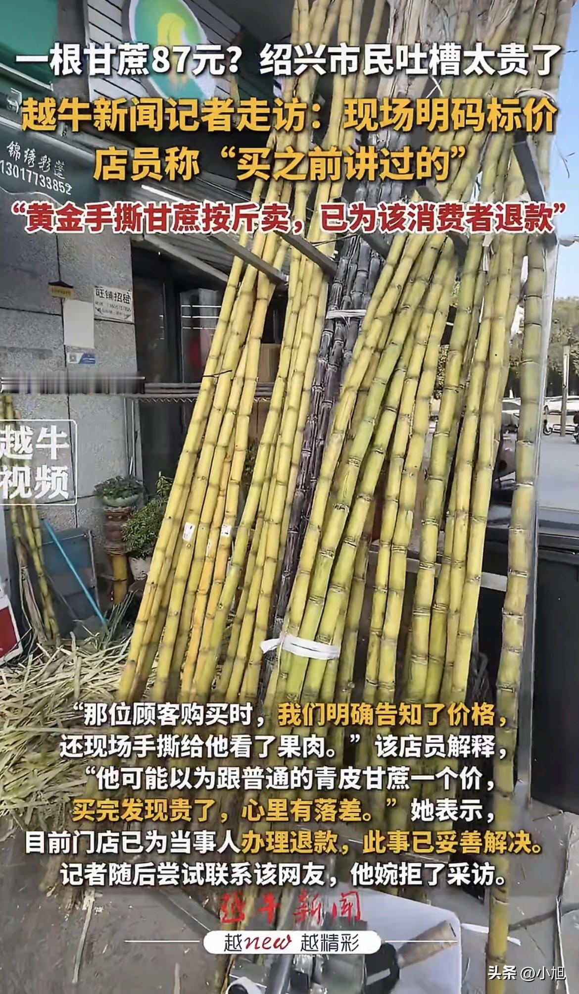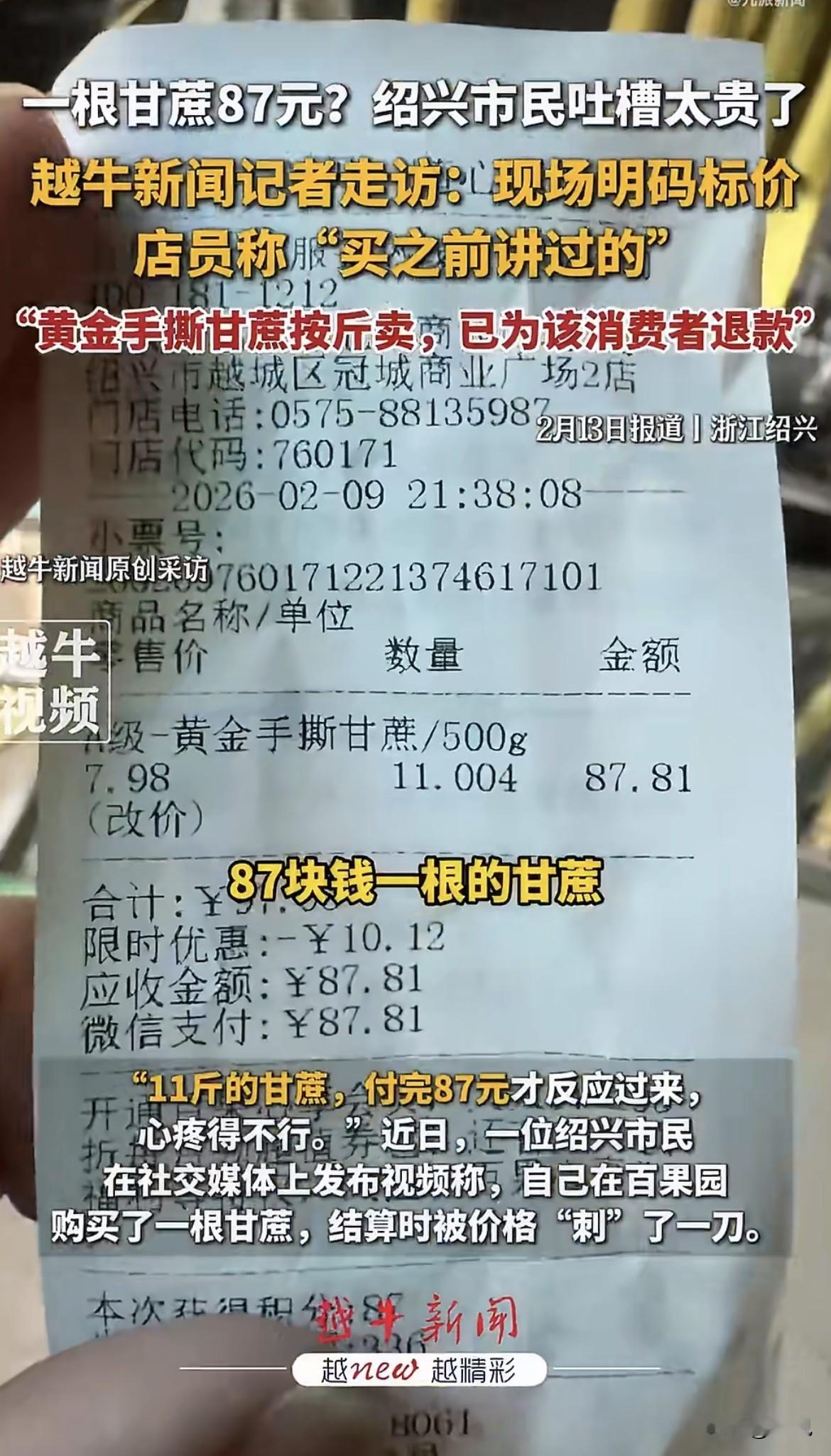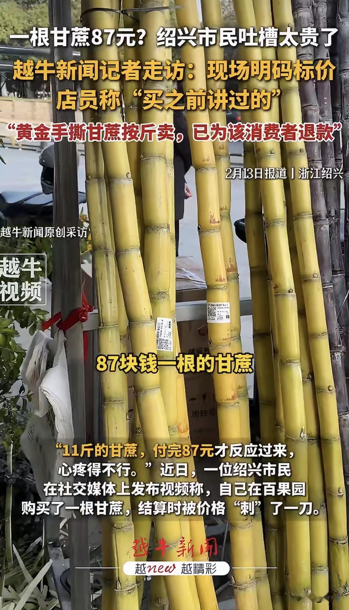 绍兴一位老兄,在百果园买了根甘蔗,87块,付完钱,心口疼了半天。 他拎着这根11斤重的“金疙瘩”回家,越想越不对劲。 不就是根甘蔗吗,怎么吃出了“刺身”的感觉? 忍不下这口气,拍了视频发网上,吐槽自己被价格狠狠“刺”了一刀。 记者听说了这事,2月12号下午,专门跑到绍兴这家百果园门店去看。 一进店门,门口最打眼的地方,齐齐整整摆着三捆甘蔗。 右边是大家最脸熟的青皮甘蔗,又粗又壮,18块钱一根,明码标价。 中间是紫皮甘蔗,颜色深红,15块钱一根,也标得清清楚楚。 最左边那捆,皮是淡金黄色的,个头比旁边俩兄弟都壮实,看着就不一样。 记者假装要买,上前问。 店员特热情,指着那捆金黄色的说:“您试试这个‘黄金手撕甘蔗’,最好吃了,果肉嫩,皮薄得用手就能撕开。” 一问价,7块9毛8一斤。 店员顺手拎起一根说,这根大概七八斤重,算下来60来块,要是挑到特别粗壮的,能到80多。 记者这才看明白。 青皮紫皮论根卖,15、18块,图个痛快。 黄金甘蔗论斤卖,7.98一斤,走的是精品路线。 店员还解释,这甘蔗百果园在卖,盒马也在卖,每天就进一捆,回头客多,基本都能卖光。 那为什么那位老兄会买完就后悔呢? 店员也委屈,当场给记者看了退款记录。 “他买的时候,我们清清楚楚告诉他价格了,还现场手撕给他看了果肉。” “他可能心里默认,甘蔗就该是十几块一根,一听总价87,心理落差太大,反应过来了。” 目前门店已经给他退了款,这事算是翻篇了。 其实仔细想想,这事挺有意思的。 店员没说谎,价格标了,也告知了,按说程序没问题。 顾客也没撒谎,确实是付完钱才反应过来,心疼是真的。 一个觉得冤枉,一个觉得委屈。 问题出在哪呢? 就出在惯性思维上。 我们习惯了甘蔗是论根卖的,十几块一根,扛起来就走。 突然冒出来一个论斤卖的,7.98一斤,听着单价也不吓人。 可甘蔗这东西,它一根能长到十来斤啊。 单价不吓人,总价吓死人。 顾客脑子里的“甘蔗计价器”,还停留在“根”的模式,没切换到“斤”的模式。 等切换过来,钱已经付完了。 这事在网上吵翻了。 有人说,这不是明码标价的事,是商家利用了消费者的习惯盲区。 你搁一堆15块的甘蔗旁边,放一根80多块的,又不突出标注,这不是等着人拿错吗? 也有人说,自己不问清楚怪谁,买了嫌贵就是矫情,退款更是无理取闹。 你怎么看? 是顾客自己没看清楚,还是商家玩了个小心思? 87块钱一根的甘蔗,换你,你买不买? 评论区聊聊。