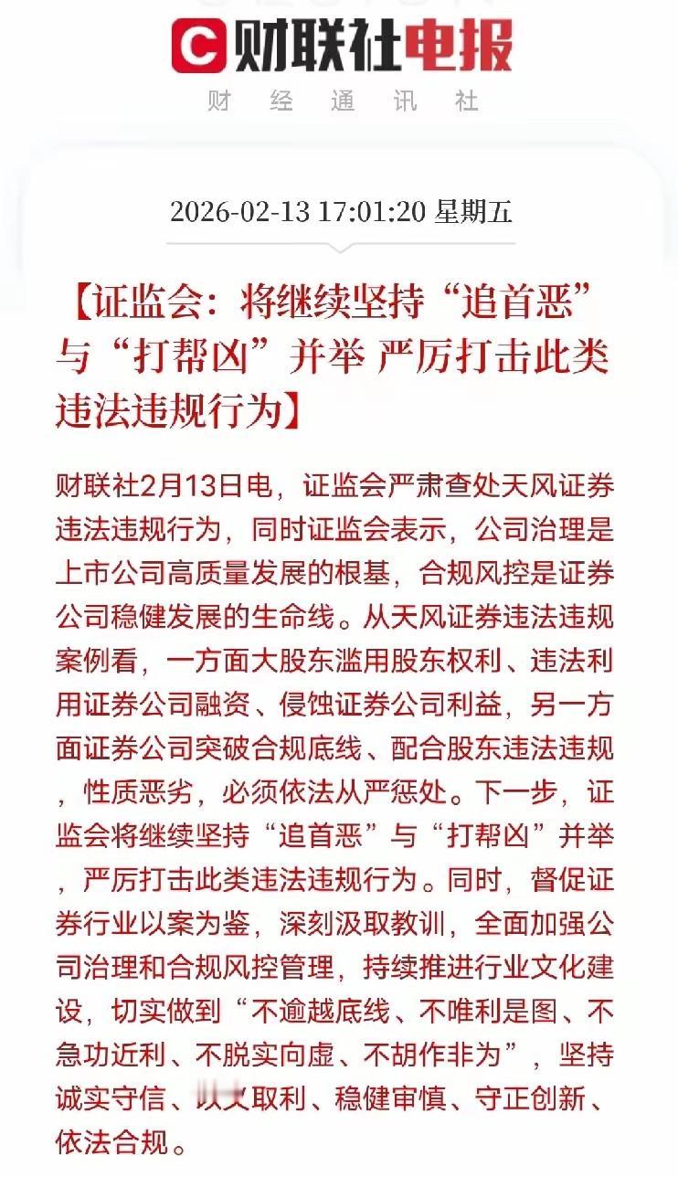 大A蛇年收蛇尾的元凶找到了,券商股尾盘带头砸盘还是有道理。原来,证监会盘后对天风证券和太平洋证券开出罚单,有先知先觉者先走一步,让大盘风声鹤唳。 当下证券市场法治严格,券商作为中介理应带头维护市场规则,但天风证券和太平洋证券却带违规,坐实了“帮凶”的定位。尾盘券商股集体跳水,当是其他券商股屁屁或多或少也有点黑。 本轮牛市中,券商股像阿斗一样扶不起,并非打压造成的,而是用法规照妖镜一看,其脊椎多少有点问题。“追首恶”与“打帮凶”并举,杀一儆百,有利于矫治证券行业,进而有利于整个大A。以这个意义上讲,蛇年末的红包虽然没了,但广大股民对此应能够理解。