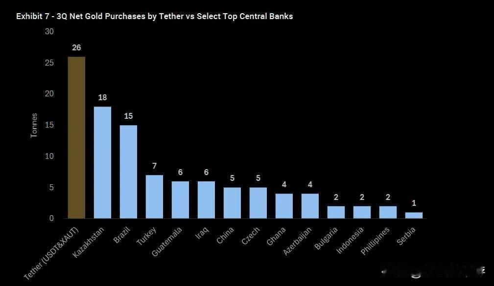 当市场还在讨论金价是否涨过头时,稳定币发行商Tether却在持续加码实物黄金。目前Tether累计持有约148吨黄金,市值约230亿美元,已成为全球最大的非主权黄金买家,整体持仓量跻身全球前30名,甚至超过部分国家央行。 近几个季度的买入速度已经接近、甚至高于一些中型国家的官方储备增量。毕竟Tether已将黄金作为长期储备资产进行配置,管理层也公开表示,目标是将投资组合中约10%–15%的资金配置于实物黄金,并搭配比特币作为另一部分配置资产。 回顾过去两年,推动金价大涨的因素包括央行购金、地缘政治风险与去美元化趋势,而Tether的持续扫货同样提供了额外的需求动能。可以确定的是,这种将资产负债表作为长期货币贬值对冲工具的做法,正让加密金融体系的参与者逐步成为实物黄金市场的重要力量。