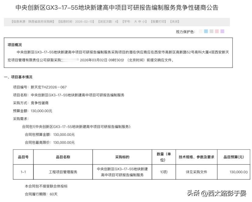 高新CID重磅利好!72班公办高中来了,未来之瞳旁教育再升级 中央创新区GX3-17-55地块新建高中项目正式发布可研报告编制竞争性磋商公告,标志着这所区域期盼已久的高品质高中,正式进入实质性推进阶段,高新CID教育短板彻底补齐! 这所高中选址高新区中央创新区核心,未来之瞳科学公园北侧,南临成业大道、北临启创路,东临星虹一路、西临星虹二路,位置优越、居住氛围浓厚。项目总建筑面积约76658.17平方米,规划建设72班城市普通高级中学,建成后将成为高新三期规模最大、标准最高的公办高中之一。 本次采购内容为项目建议书、可行性研究报告、社会稳定风险评估报告编制,预算13万元,流程规范、推进迅速,为项目早日开工建设奠定坚实基础。 长期以来,高新三期小学、初中配套不断落地,但高中阶段资源一直是空白。这所72班高中的到来,直接填补区域高中教育缺口,与周边已投用的高新一小、高新一中分校等形成幼、小、初、高全龄教育闭环,真正实现家门口一站式成才。 作为丝路科学城核心配套,该校不仅服务周边数万居民,更能为高新产业人才提供优质教育保障,助力留住高端人才、提升板块宜居价值。随着前期工作加速推进,学校开工、建成指日可待,未来在家门口就能上优质高中。 高新三期发展再提速,教育、交通、生态全面兑现,这里正在成为西安最具潜力的科创新城! 西安 高新区 高新三期 未来之瞳