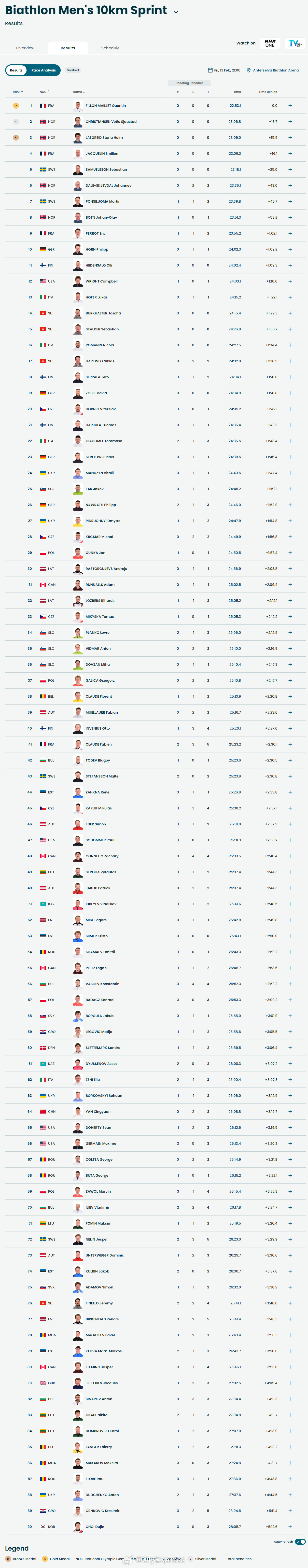 【冬奥冬季两项男子10公里法国夺冠】冬奥会 2月13日,冬奥会冬季两项男子10公里短距离比赛结束。法国选手费隆-迈勒以22分53秒1夺得金牌,挪威克里斯蒂安森和拉格雷德分获银铜牌。中国选手闫星元排名第64。