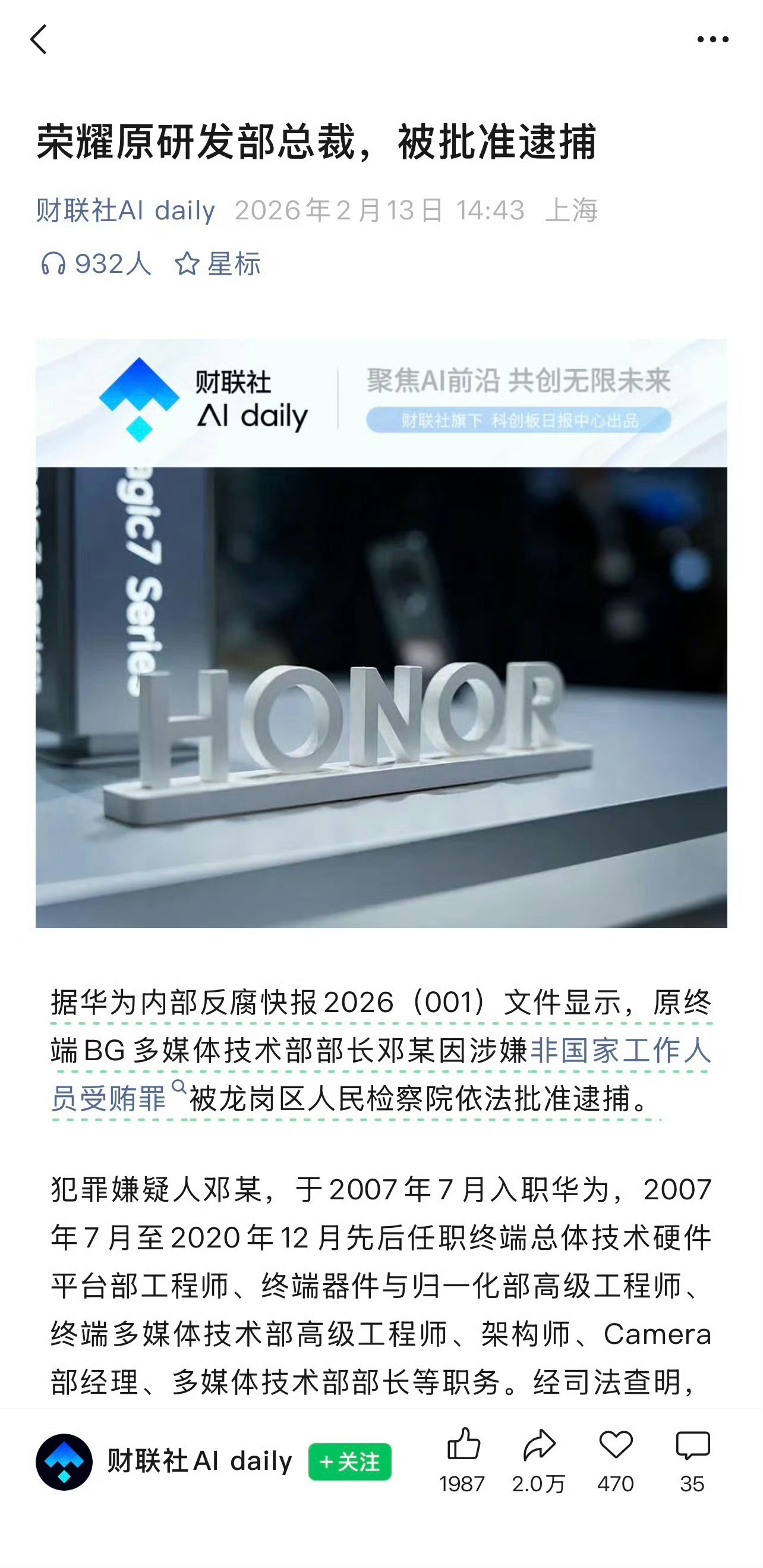 荣耀研发管理部原总裁邓斌因违反公司商业行为准则(BCG),已于2024年5月被荣耀除名。