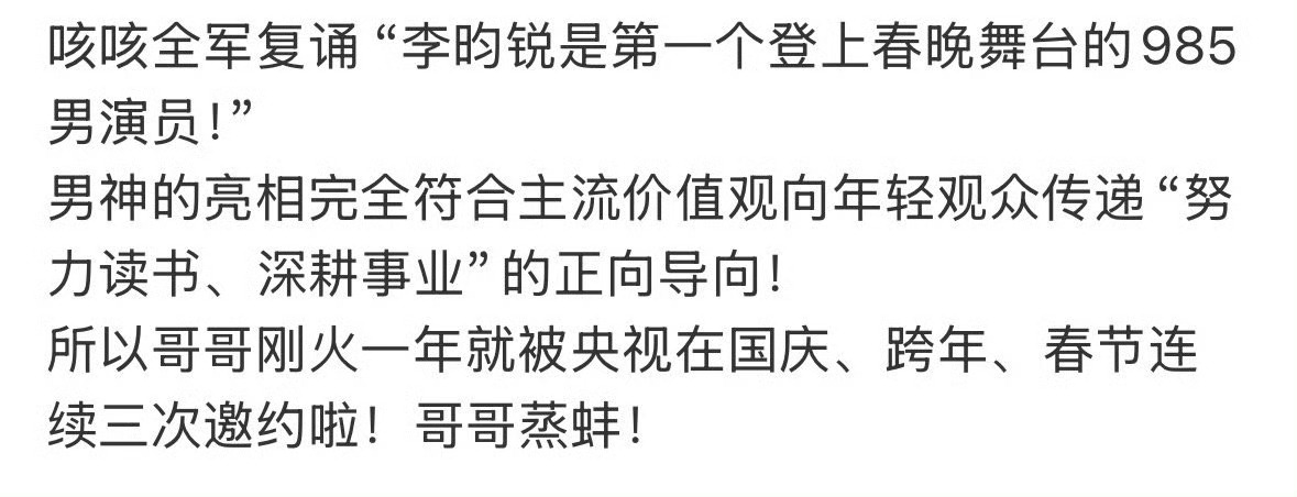 李昀锐是第一个登上春晚的985演员,刚火一年就被央视在国庆、跨年、春节连续三次邀