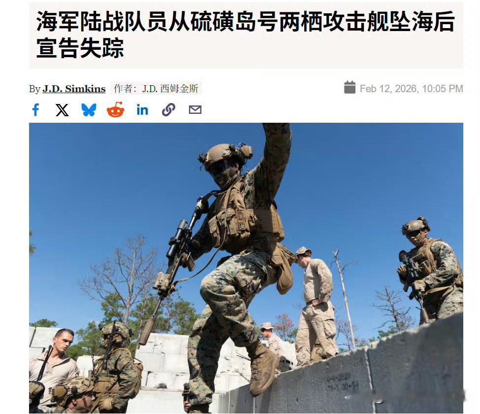 美军再出重大事故,美国军方周四表示,一名隶属硫磺岛号两栖攻击舰的美国海军陆战队员,于 2 月 7 日在加勒比海落水,经过 72 小时搜救未果后已被宣布死亡。