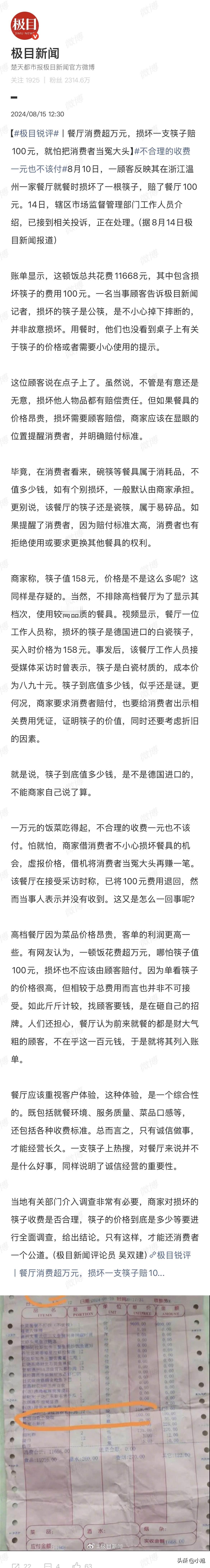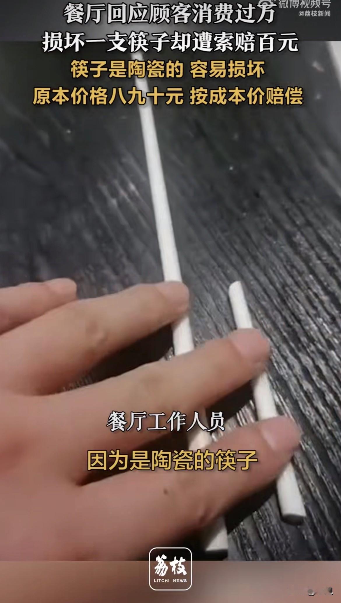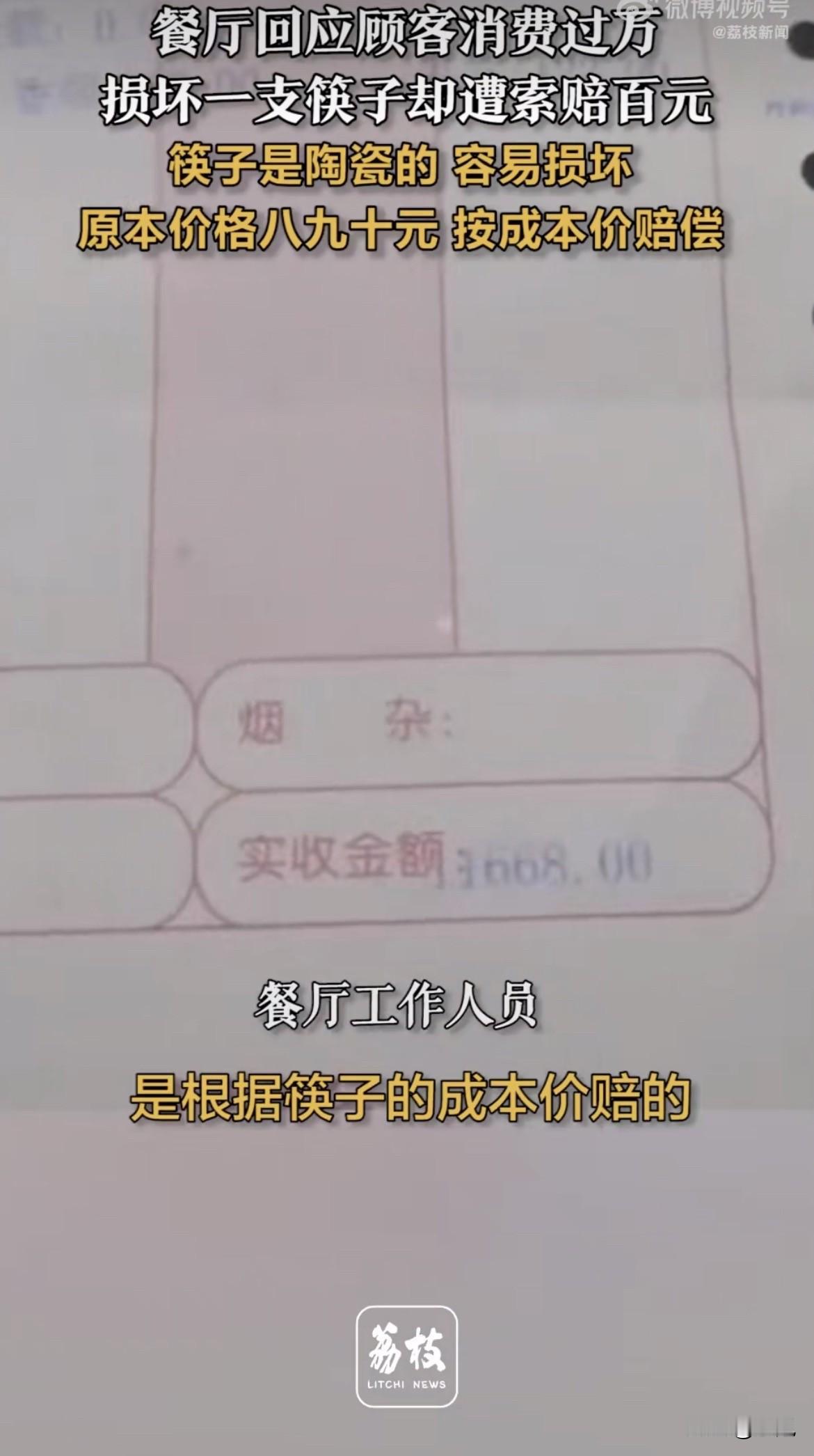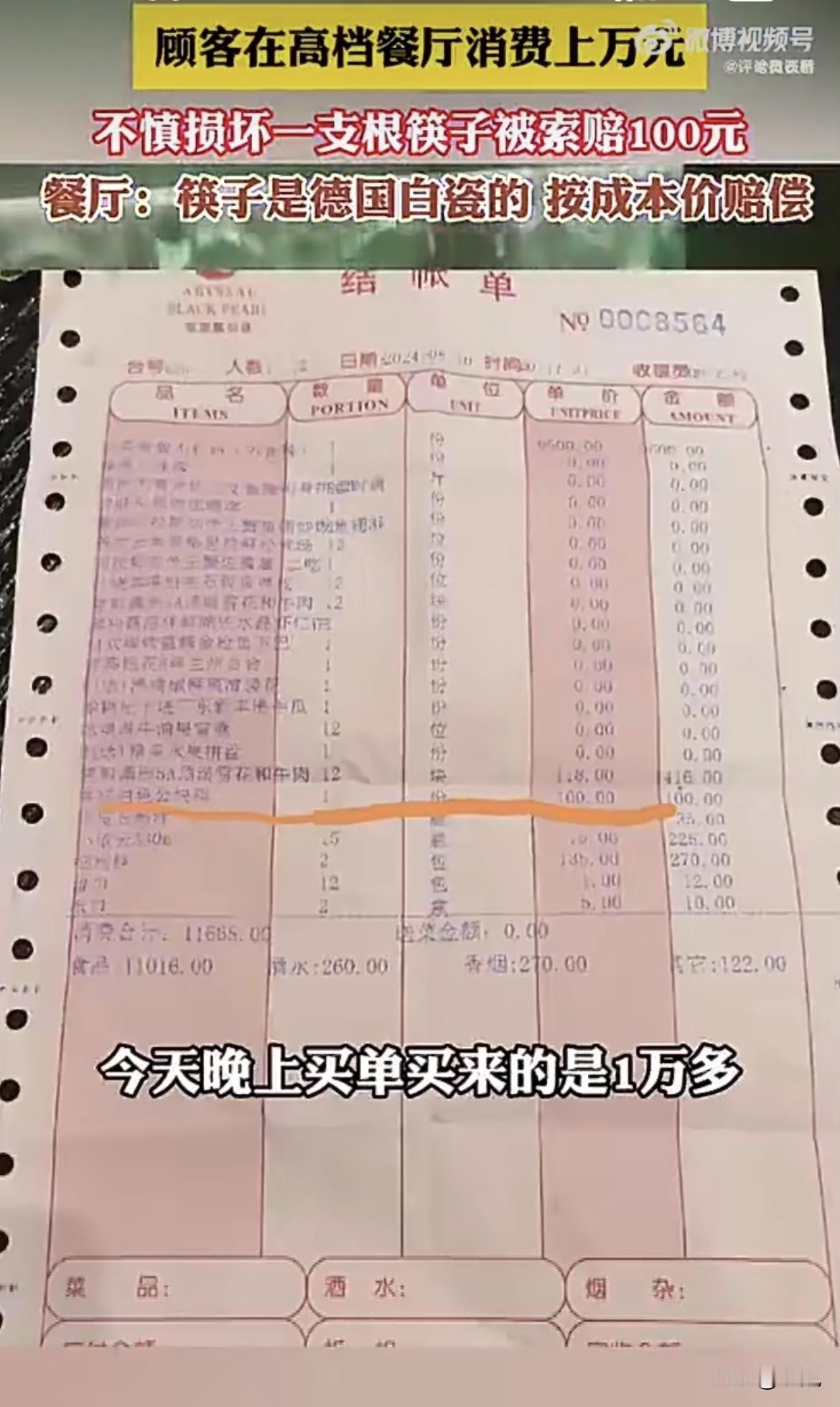 大温州的“深海黑珍珠”餐厅,听着就是个高档地方。 这桌客人吃完饭,服务员拿来账单:总共11668元。 大伙儿一看,也没多想,扫码付钱走人。 回去之后,有人翻出账单细看,发现不对劲。 11668里头,单独列了一项:损坏筷子,100元。 他想了半天,才回忆起来。 吃饭时,桌上那双公筷,不知道谁不小心碰了一下,掉地上,摔断了。 就这? 一根筷子,100块? 他打电话问餐厅。 餐厅说,那是德国进口的白瓷筷子,买入价158元,收你100已经是折后价了。 这位客人越听越气。 他说,当时桌子上没有任何提示,说这筷子有多金贵,也没人提醒他们要小心使用。 要是知道一根筷子值158,谁还敢用? 直接让服务员拿走收起来就完了。 更别说,那筷子是瓷的,本来就脆,掉地上摔断,怪谁呢? 他把这事发到网上,评论区炸了。 有人说,一顿饭花一万多的人,会在乎这一百块? 还真不是钱的事。 是你收这笔钱,收得让人心里不舒服。 餐厅后来跟媒体解释,筷子成本是八九十块,按成本价收的。 可一开始明明说的是158的进口价。 到底是158,还是八九十? 这筷子是不是真从德国来的,有报关单吗? 商家一张嘴,价格随便说,消费者只能认? 更戏剧性的是,餐厅说已经把这100块钱退给顾客了。 可当事顾客一脸懵:退给谁了?我朋友结的账,压根没收到。 温州鹿城区市场监管局已经介入,辖区监管所在处理。 但这事的争议,不是退100块钱就能平息的。 有人算账,一双筷子158,一桌按10个人算,光筷子就1580。 这哪是吃饭,这是捧着餐具公司在吃。 万一哪天摔个碗,是不是得赔套房? 高档餐厅用高档餐具,没毛病。 但既然是易碎品,又这么贵,你得提前告诉人家。 放个提示牌,或者服务员上菜时提醒一句:“您小心点,这筷子德国来的,一百多一根。” 客人听了,要么加倍小心,要么直接说给我换双普通的。 这不就完了吗? 什么都不说,摔了再报价,跟碰瓷有什么区别? 还有人说,这根本不是钱的事,是态度。 你一顿饭挣了人家上万,一根筷子摔断了,大大方方说一句“没事,筷子而已”,客人心里反而记着你的好。 非要列在账单上,收这一百块,挣了这一百,丢了什么,自己掂量。 市监部门已经介入,筷子的真实价格、有没有明码标价、该不该赔,都会有个说法。 但留给餐厅的这笔账,怕是算不清了。 据说后来把钱给退回去了 你怎么看? 一顿饭一万多,摔坏一根筷子,该不该赔这100块?