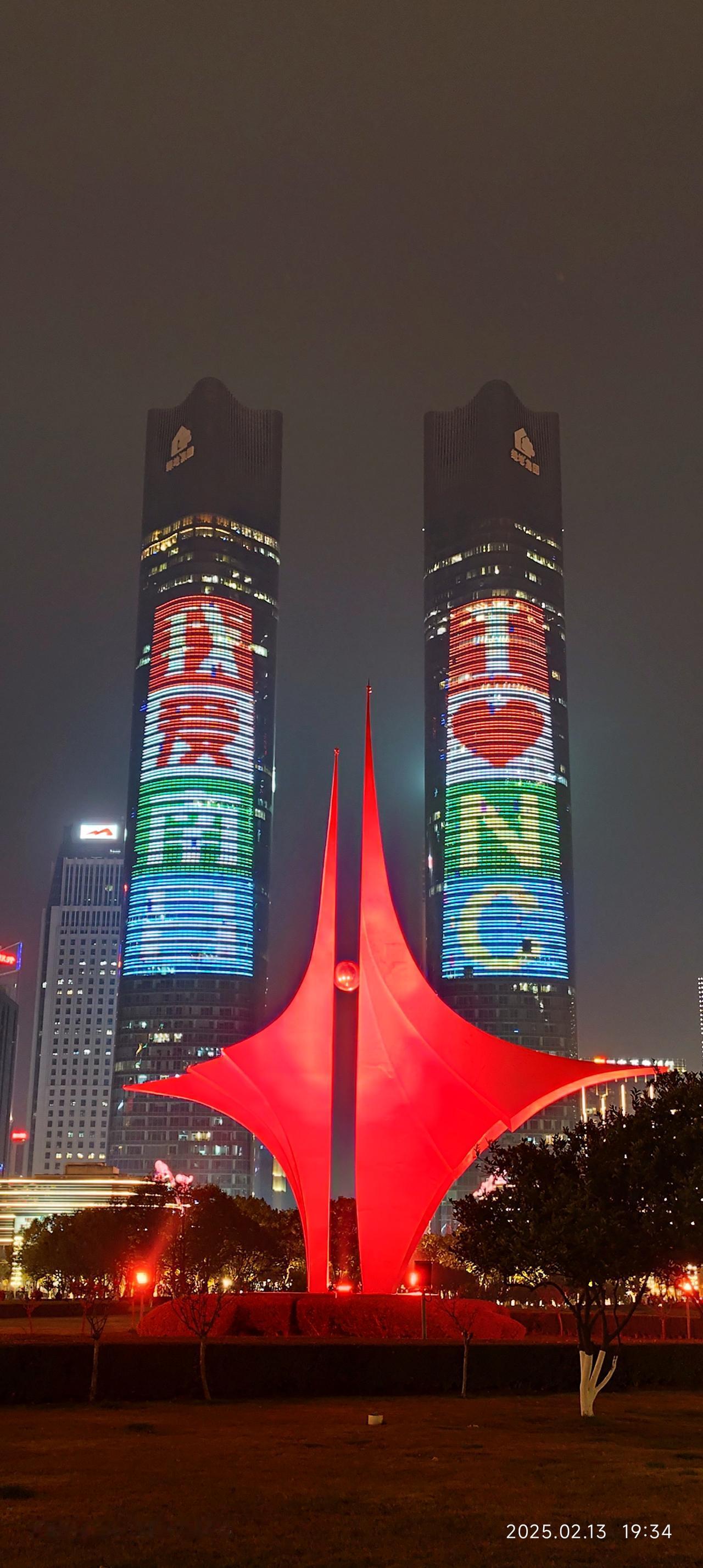 图中的红色雕塑名为“崛起”,位于南昌红谷滩世纪广场,是南昌的城市精神象征,寓意着南昌的蓬勃发展与时代腾飞。背景的双子楼是南昌绿地中心(绿地双子塔),高度为303米,是江西省第一高楼