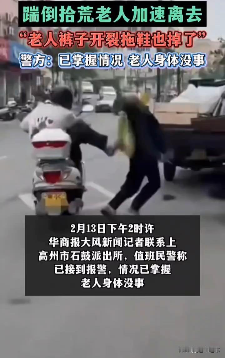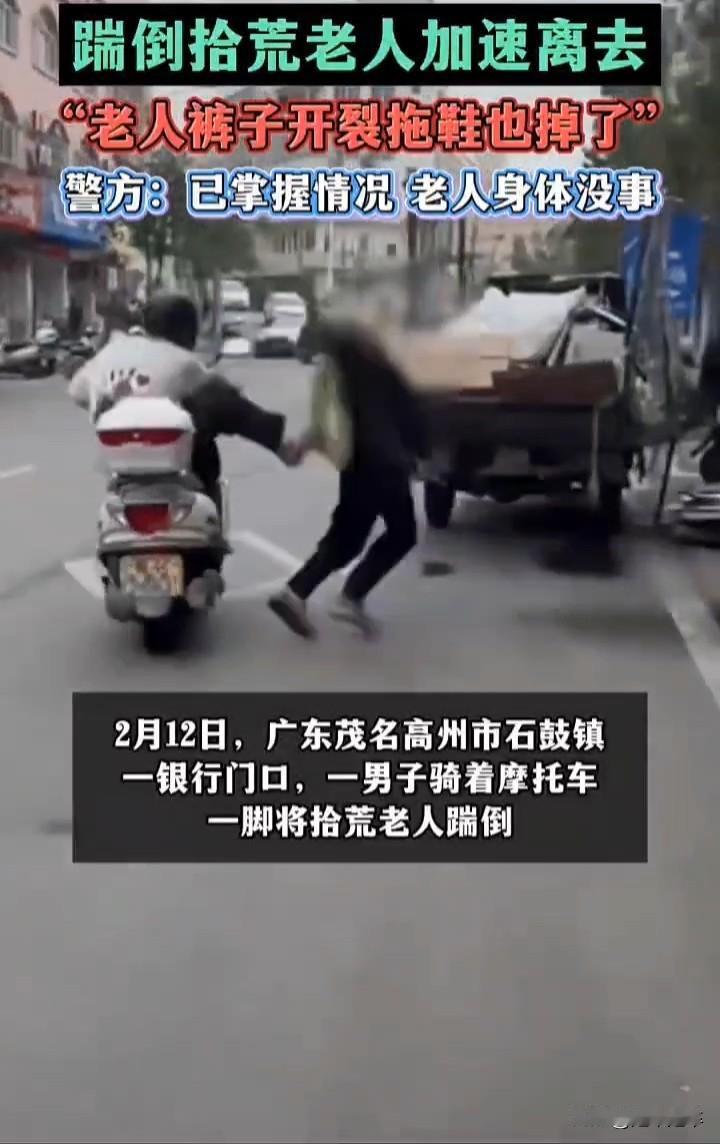 如此变态必须严惩不贷。 2月12日,一名拾荒老人在广东茂名高州市石鼓镇某银行门口扛着黄色袋子行走时,被后方驶来的粤K牌照摩托车男子突然伸脚踹倒。老人重摔在地,裤子臀部位置开裂、拖鞋脱落,而摩托车后方有人全程跟拍,视频中可清晰听到踹人者的笑声。石鼓派出所13日证实已接警,掌握涉事摩托车信息,并确认老人身体无大碍。案件正按程序处理。 涉事男子行为带有明显恶意,看似以欺凌弱势群体取乐。老人靠自己的身体讨生活,没挡路没惹谁,平白被一脚踹倒。施暴者针对无威胁的拾荒老人实施无故侵害,跟拍者嬉笑挑衅。这种无故伤害他人、公然挑衅公序良俗的行为,已经触犯治安管理处罚法,涉嫌寻衅滋事。无论施暴者是不是成年人,对无故侵害弱势群体的行为都该加重处罚力度。