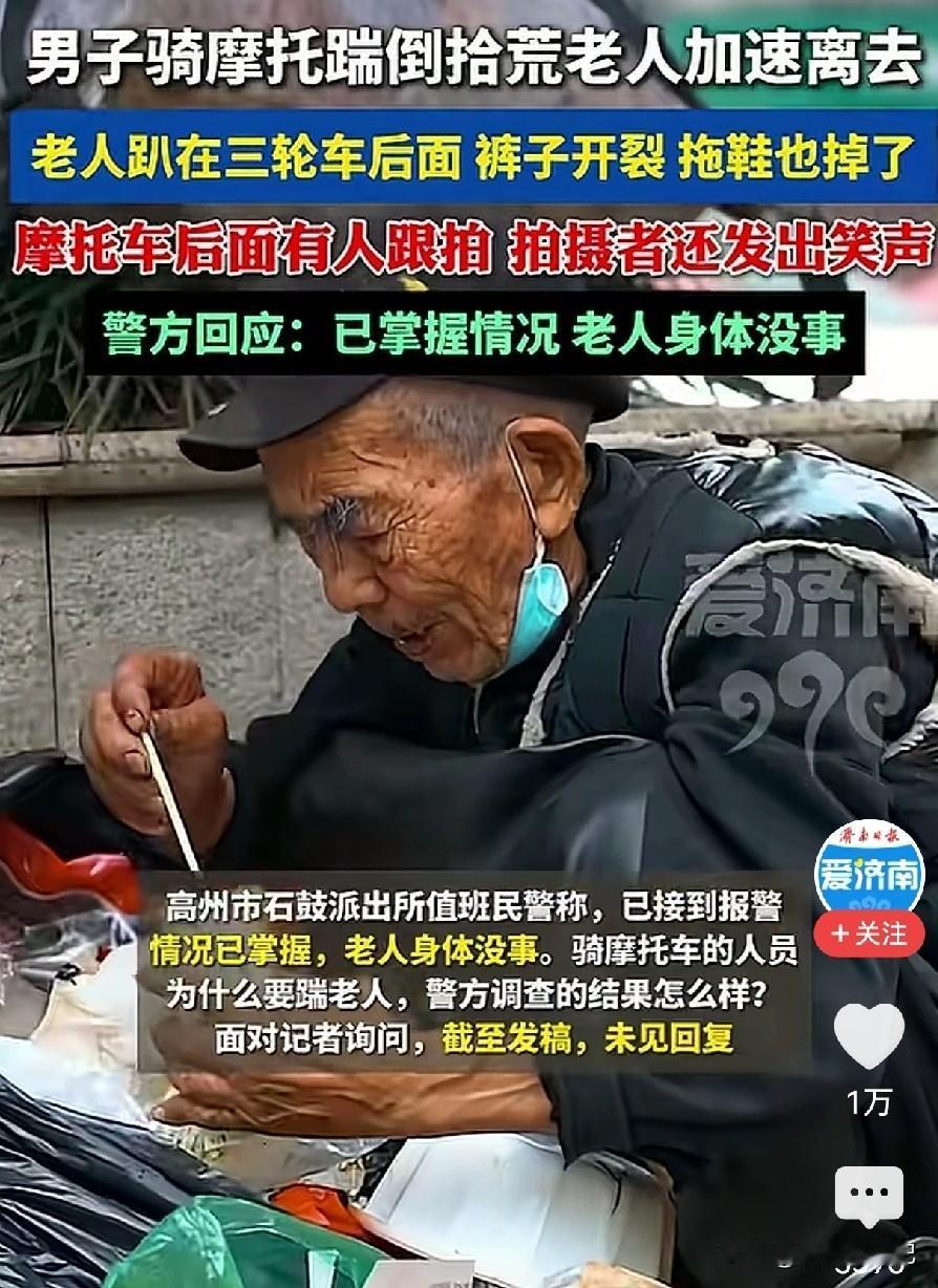 怎么会有这么坏的人!广东一辆粤K牌照的摩托男,在路上看到一位拾荒老人,无冤无仇、素不相识的情况下,车主竟然悄悄开到老人身后,猛地一脚把老人狠狠踹倒,随后加速逃离现场。 老人毫无防备,瞬间扑倒在三轮车上,裤子被摔裂,鞋子直接飞出去,整个人痛苦倒地。 更让人愤怒到的是,摩托车后面还有个跟拍者,全程举着手机录像。老人被踹倒在地、动弹不得时,他们不仅不帮忙,反而发出刺耳的嘲笑和起哄声,把欺负弱者当成取乐,毫无半点人性。 老人本就生活艰难,靠拾荒勉强糊口,本本分分、不惹谁不害谁,却平白无故遭此横祸。这两个年轻人,却把最狠的一脚,踹向了最弱势的老人。 这种行为,已经不是不懂事,而是坏到骨子里。欺负弱者、寻衅滋事、恶意伤人,每一条都触碰道德底线,更触犯法律。 老人何辜?生活已如此艰难,还要承受无端的暴力与羞辱。目前警方表示已经掌握了情况,老人身体无恙。 生而为人,请务必善良。可以不帮,但别伤害;可以冷漠,但别作恶。欺负老人、欺凌弱小的人,终究会被全社会唾弃,被法律严惩! (图片来自网络视频)